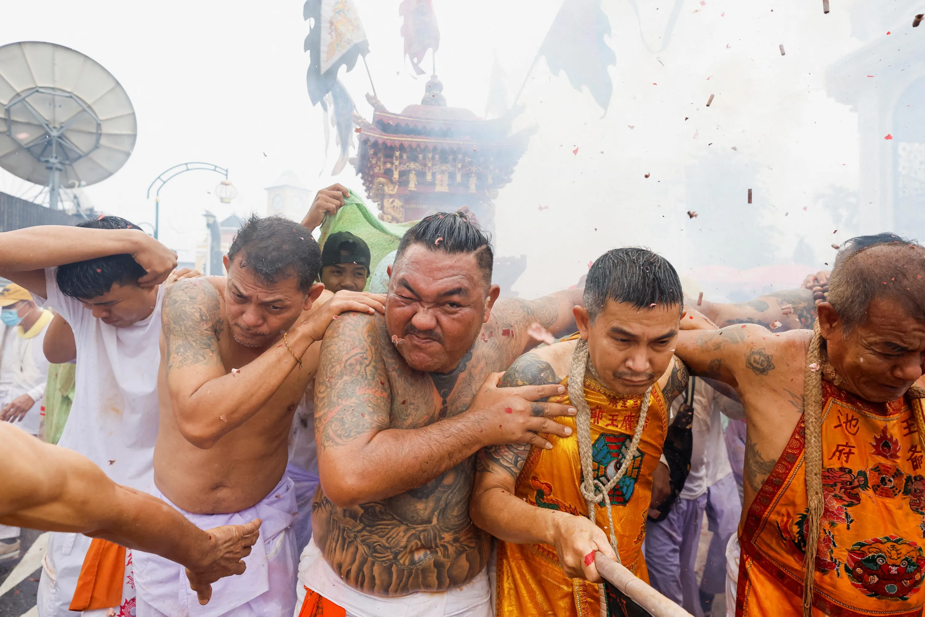 People participate in the Bang Neow Shrine procession during the annual vegetarian festival, observed by Taoist devotees from the Thai-Chinese community in the ninth lunar month of the Chinese calendar, in Phuket, Thailand on October 1, 2022. (Photo by Jorge Silva/Reuters)