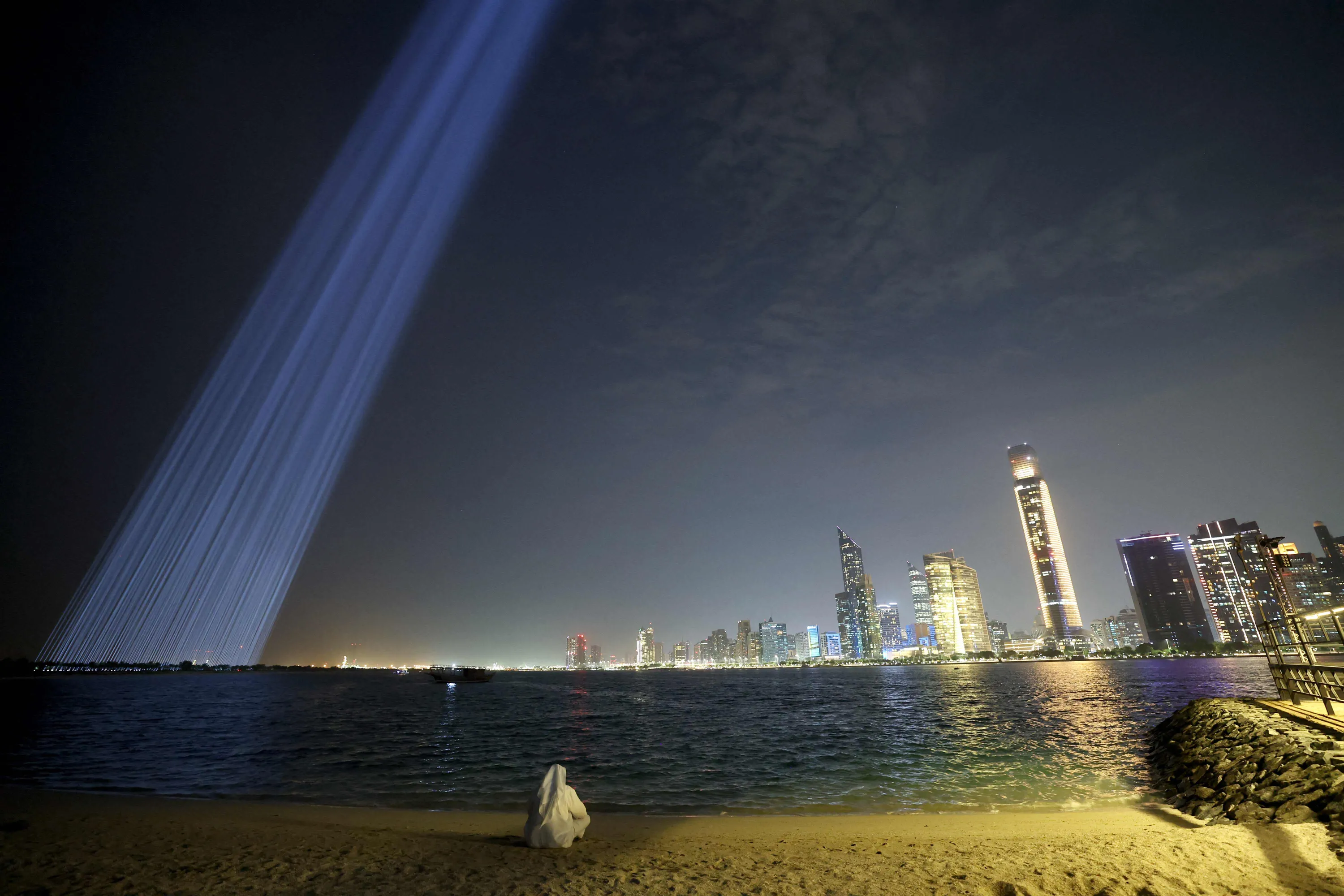 Mexican artist Rafael Lozano-Hemmer's artwork entitled “Collider”, formed by hundreds of pencil-beam robotic searchlights that create a glimmering curtain of light, is visible from al-Lulu Island on the backdrop of the Abu Dhabi downtown on November 20, 2023, during the Manar Abu Dhabi public light art exhibition. (Photo by Giuseppe Cacace/AFP Photo)