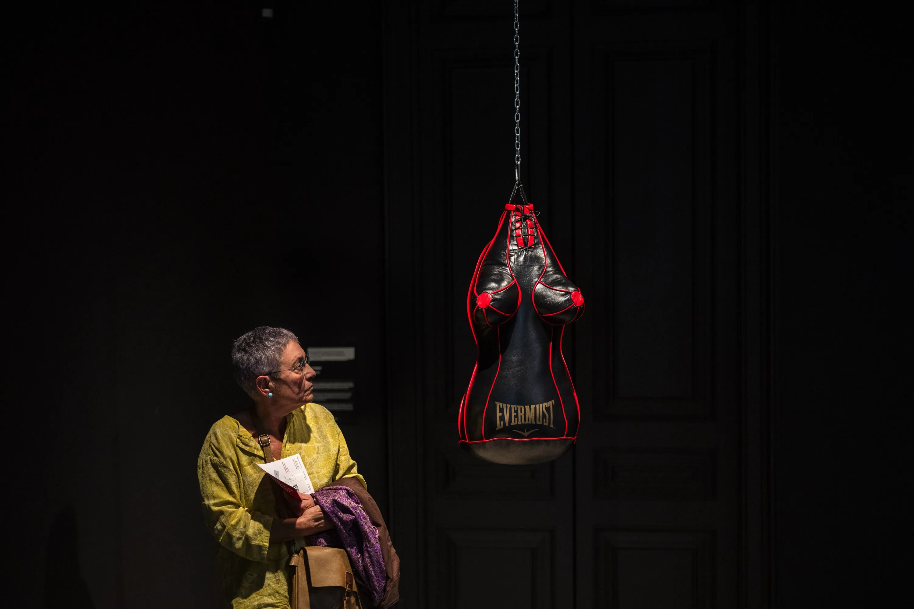 A visitor looks at a leather sculpture of a woman's torso as a boxer's punching bag at Barcelona's Museum of Forbidden Art in Barcelona, Spain, Friday, November 17, 2023. The physical abuse of women is captured by Kazakh artist Zoya Falkova in Evermust. It was one of six works removed from a museum in Kyrgyzstan when an exhibition of feminist art came under fire from officials who said it went against traditional values. A new museum in Barcelona is offering a second chance to controversial artworks that have suffered censorship for religious, sеxual, political or commercial reasons. (Photo by Emilio Morenatti/AP Photo)