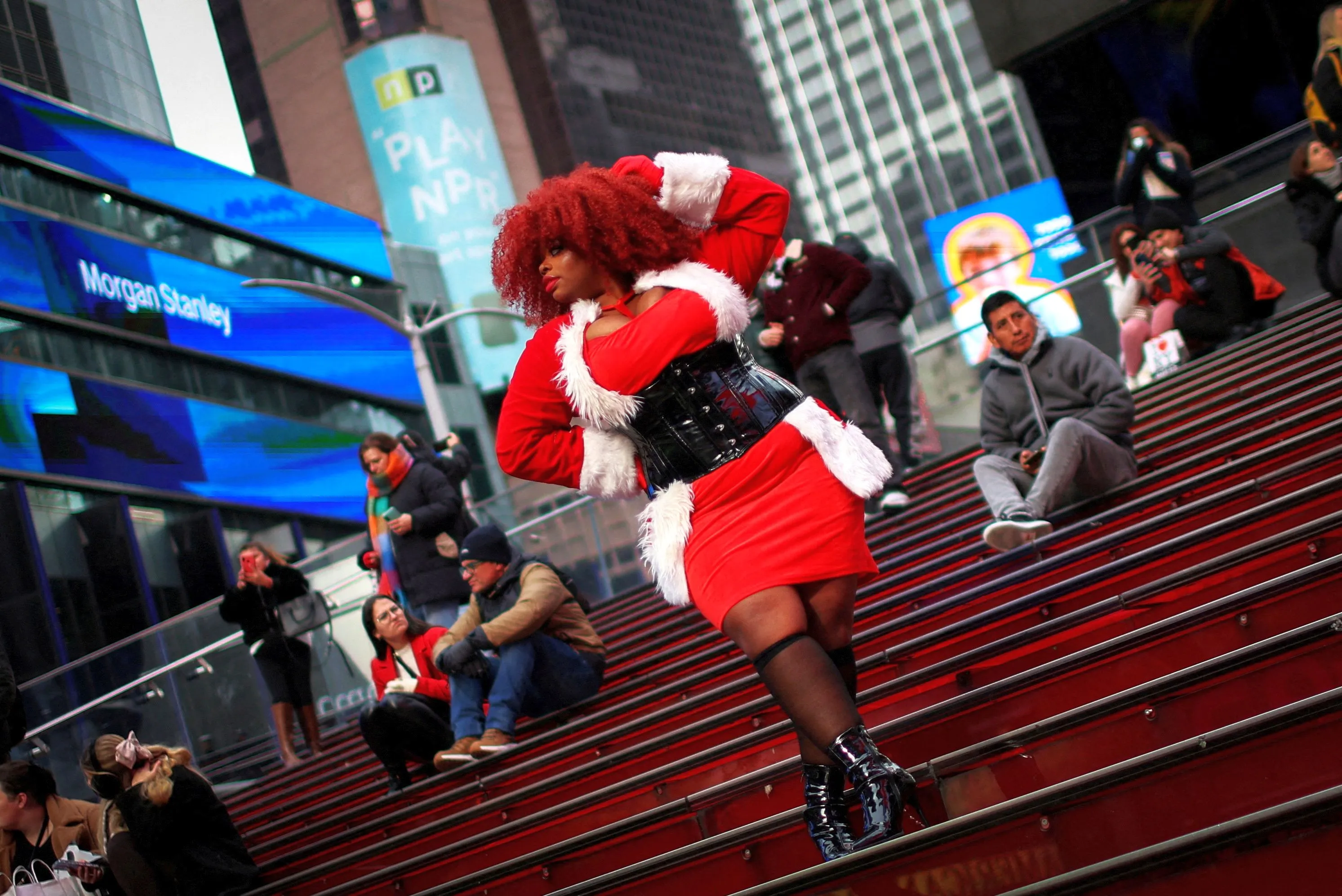 A woman in a Christmas themed outfit poses on steps in Times Square in Manhattan in New York City on December 5, 2023. (Photo by Mike Segar/Reuters)