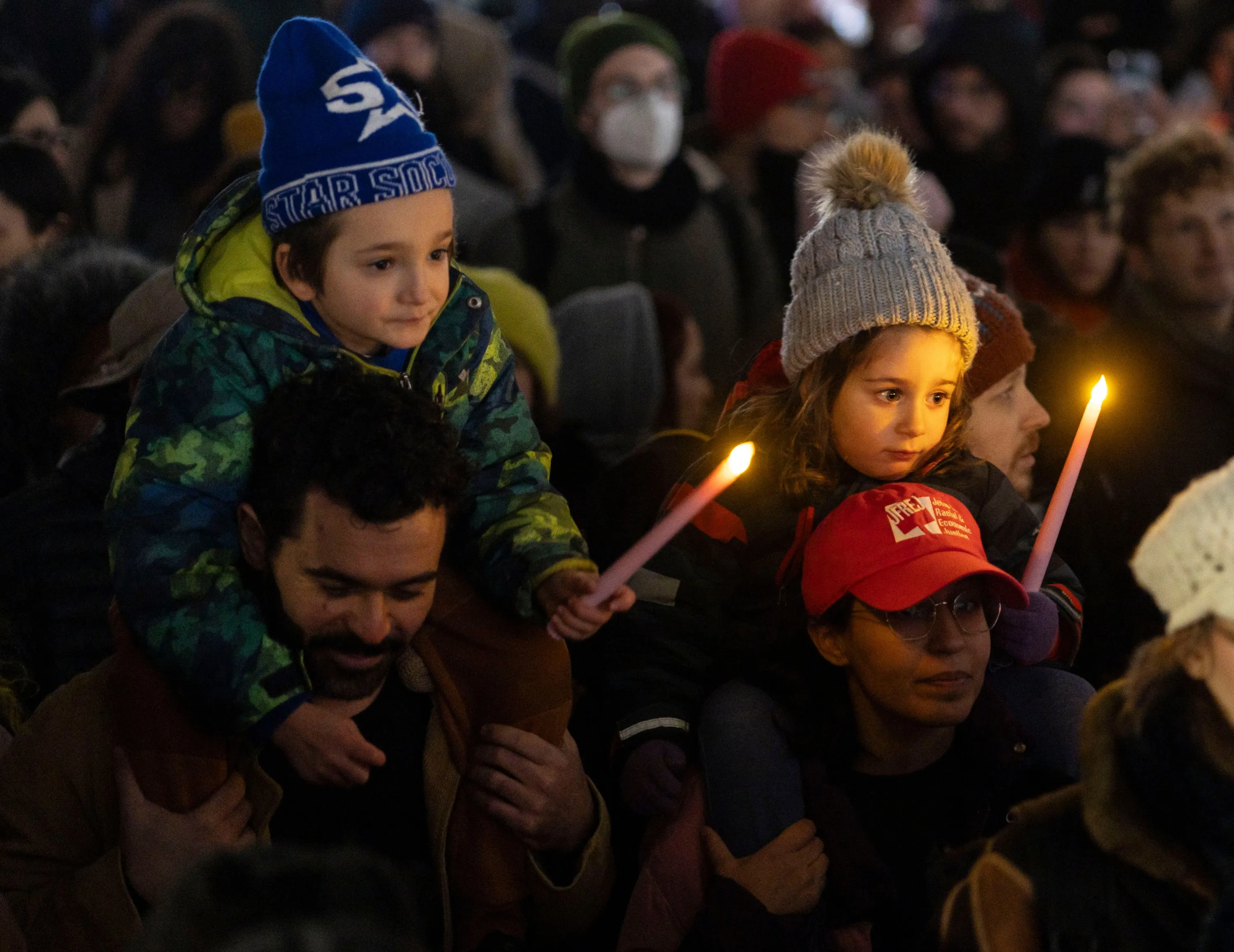 People gather for a vigil calling for a ceasefire in fighting between Israel and Hamas at an event organized by the group Rabbis for Ceasefire to coincide with the lighting of the candles to mark the first night of the Jewish holiday Hanukkah in New York, New York, USA, 07 December 2023. Thousands of Israelis and Palestinians have died since the militant group Hamas launched an unprecedented attack on Israel from the Gaza Strip on 07 October, and the Israeli strikes on the Palestinian enclave which followed it. (Photo by Justin Lane/EPA/EFE)