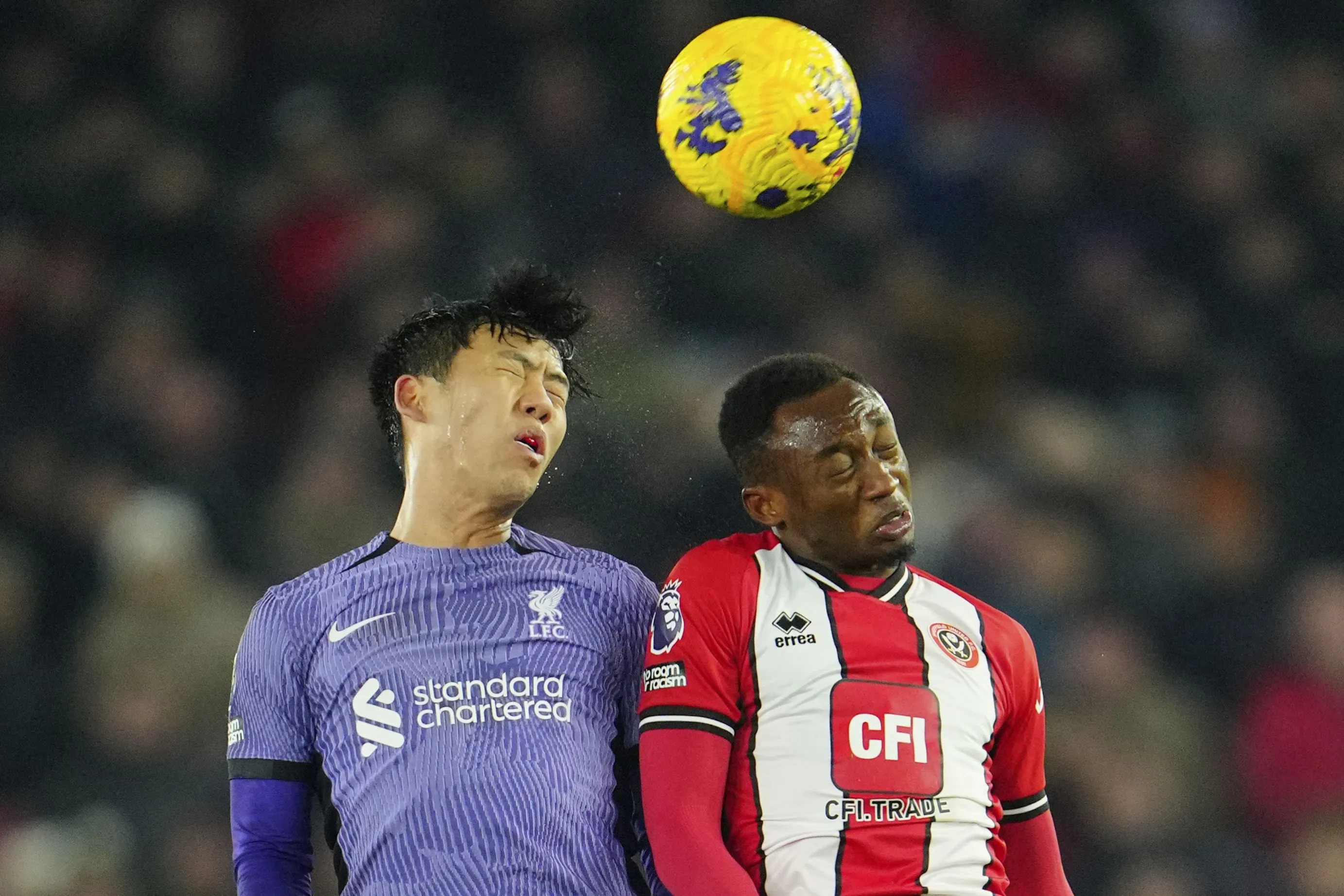 Liverpool's Wataru Endo, left, jumps to head the ball with Sheffield United's Benie Traore during the English Premier League soccer match between Sheffield United and Liverpool at Bramall Lane in Sheffield, England, Wednesday, December 6, 2023. (Photo by Jon Super/AP Photo)