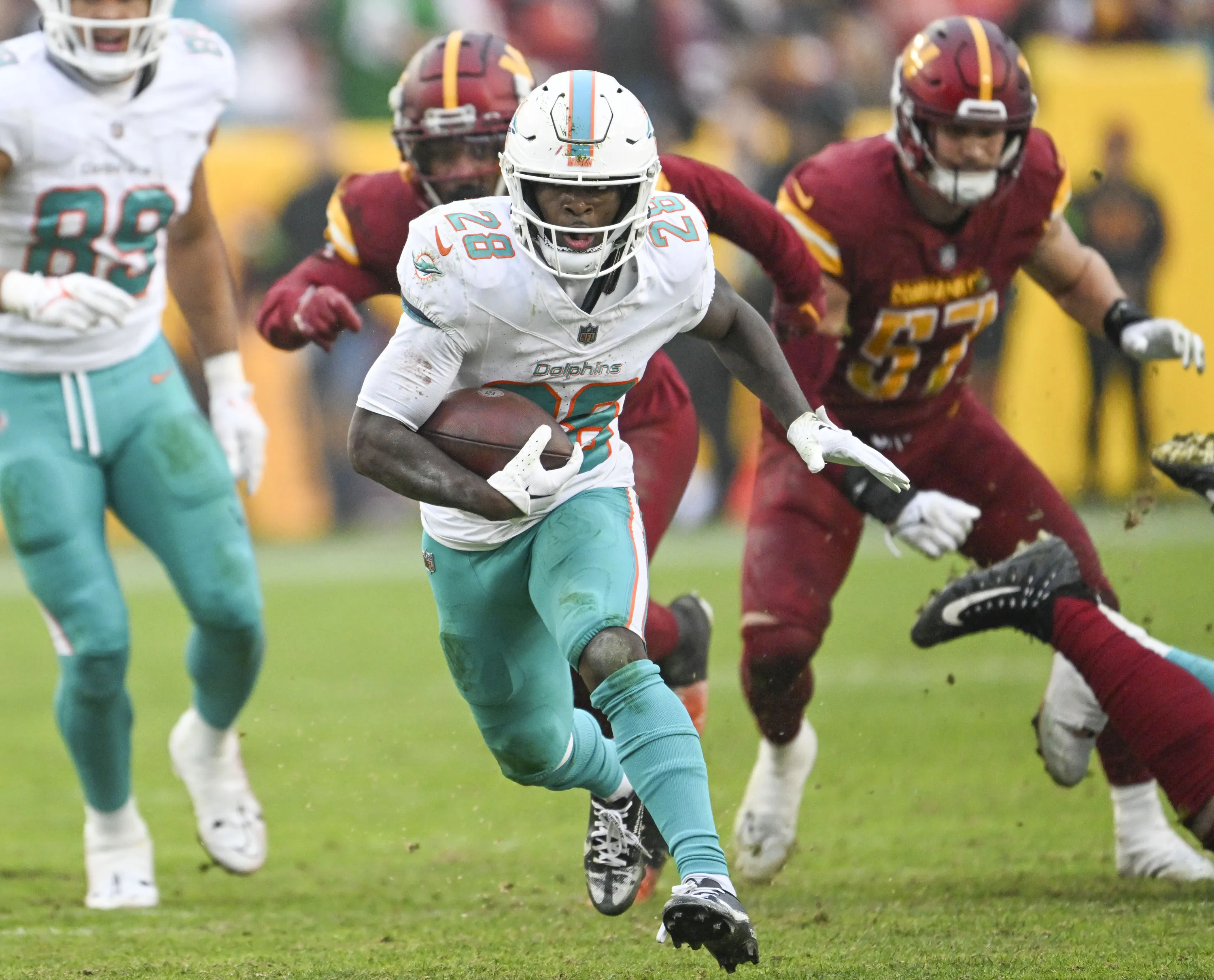 Miami Dolphins running back De'Von Achane (28) churns upfield during fourth quarter action against the Miami Dolphins at FedEx Field on December 3, 2023. (Photo by Jonathan Newton/The Washington Post)