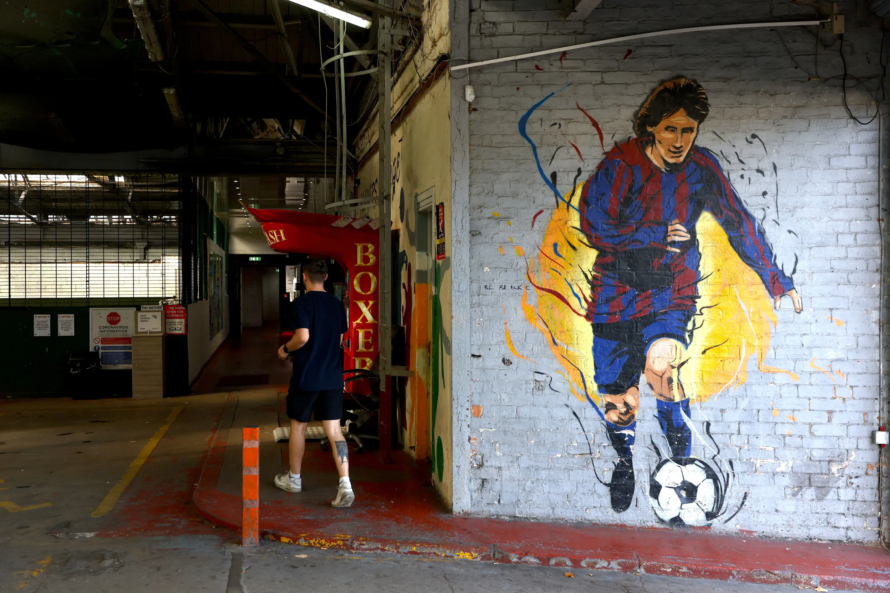 A man walks past a mural of Lionel Messi in Glasgow, Scotland on September 11, 2023, before an international friendly football match between Scotland and England. (Photo by Carl Recine/Reuters)