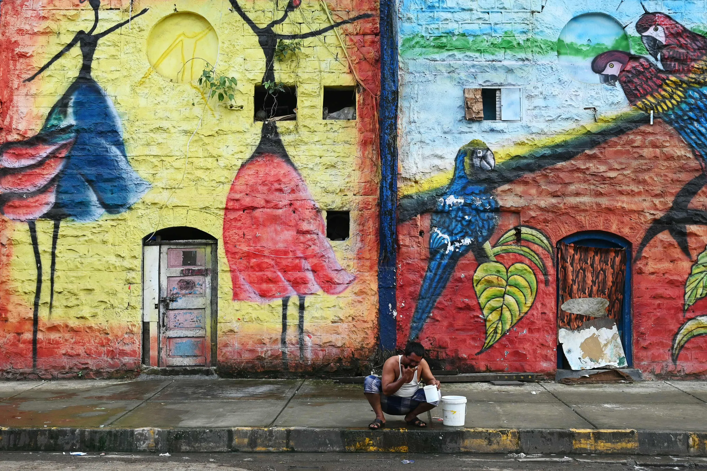 A man washes himself early in the morning outside a warehouse decorated with a wall mural in Mumbai on September 30, 2023. (Photo by Indranil Mukherjee/AFP Photo)