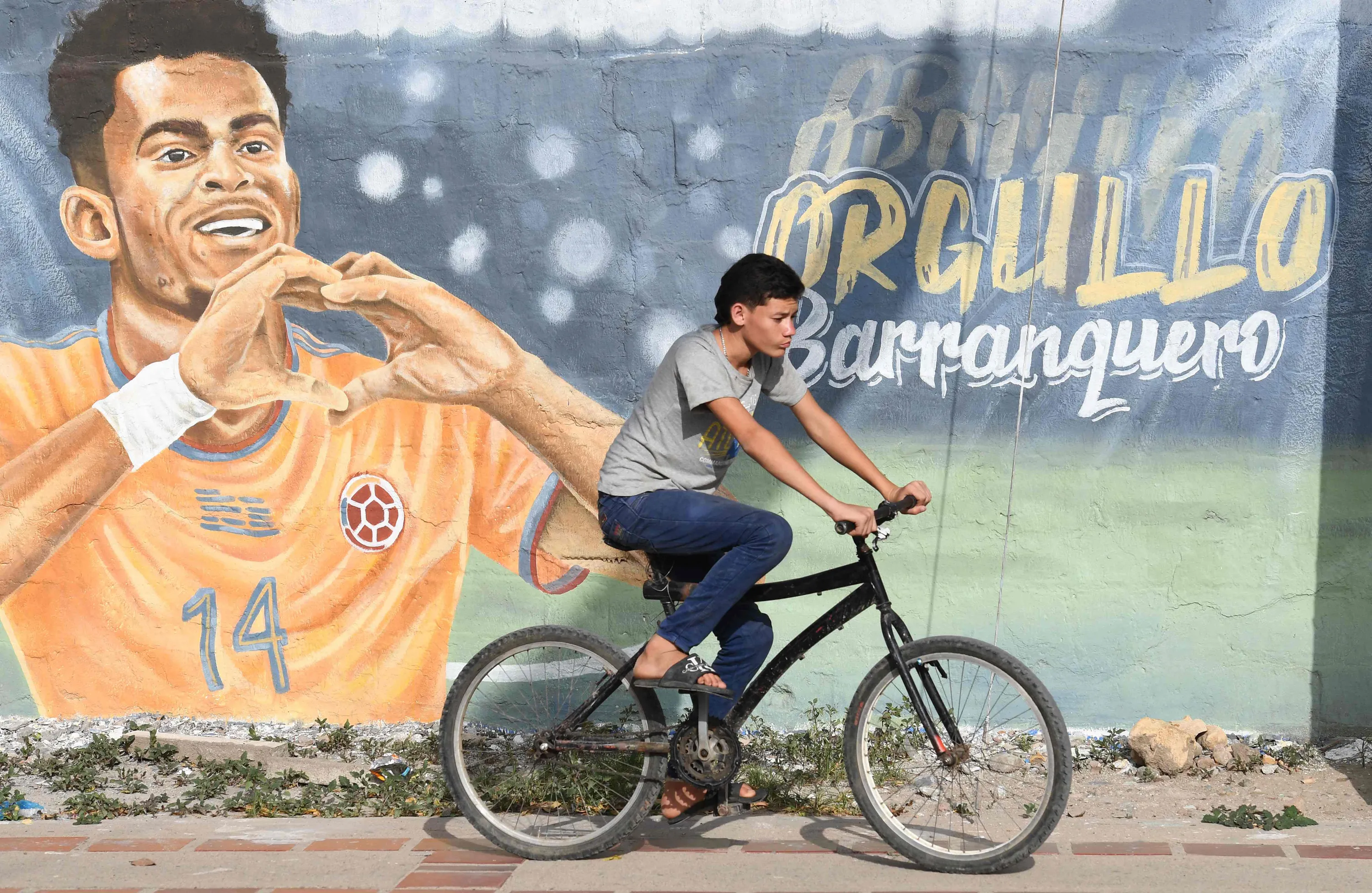 A man rides a bike past a mural depicting England's Liverpool football star Colombian Luis Diaz, in Barrancas, Guajira province, Colombia, on May 22, 2022. With bare feet on dusty fields, an indigenous man who aspires to become an European champion, began kicking the ball: Luis Diaz, the phenomenon who emerged from a desert forgotten by football in Colombia. (Photo by Daniel Munoz/AFP Photo)