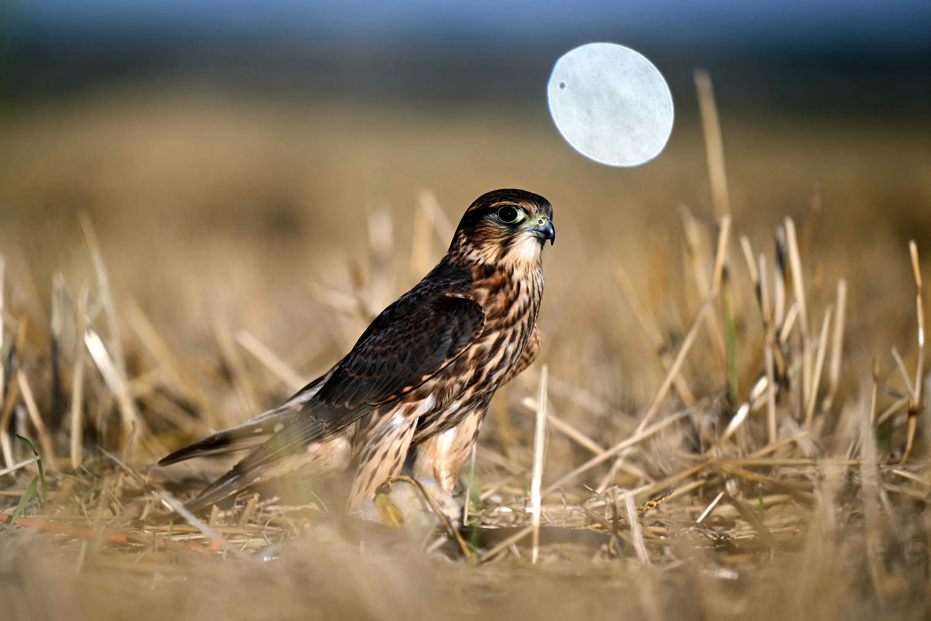 Imp, a Merlin falcon male that flies in different part of London including Lord's cricket ground, looks on after catching a chick, during its daily training at the Avian Environmental Consultants ground, near Brigstock, Northamptonshire on September 4, 2023. The Avian Environmental Consultants supplies bird control services by training falcons and hawks in order to prevent birds in general from roosting or ground dwelling in specific areas, such as monuments, like Westminster Abbey, or near industrial zone, but also during events like Wimbledon Tennis Championships or cricket matches at Lord's cricket ground. (Photo by Daniel Leal/AFP Photo)