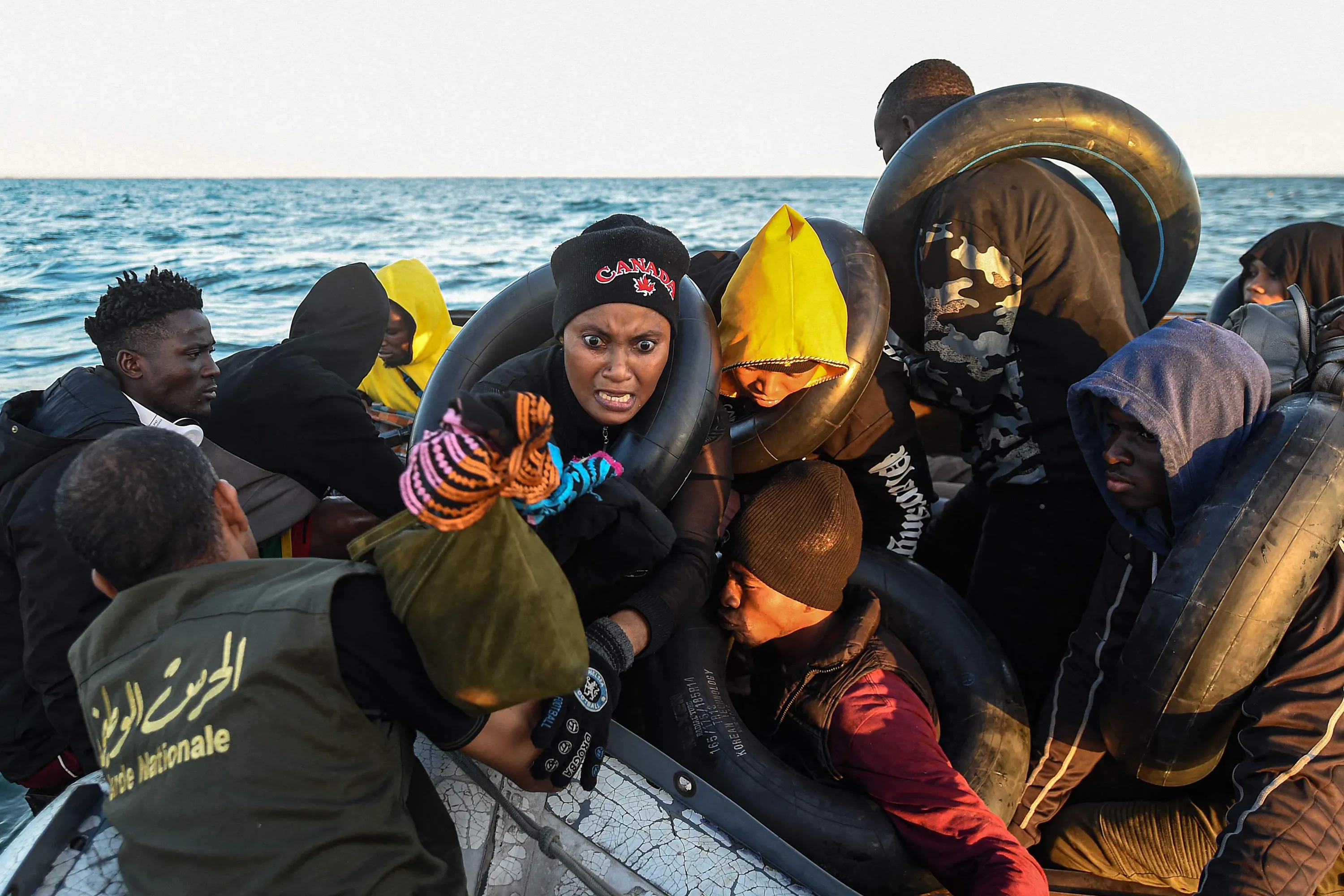 Migrants from sub-Saharan Africa sit in a makeshift boat that was being used to clandestinely make its way towards the Italian coast, as they are found by Tunisian authorities about 50 nautical miles in the Mediterranean sea off the coast of Tunisia's central city of Sfax on October 4, 2022. (Photo by Fethi Belaid/AFP Photo)