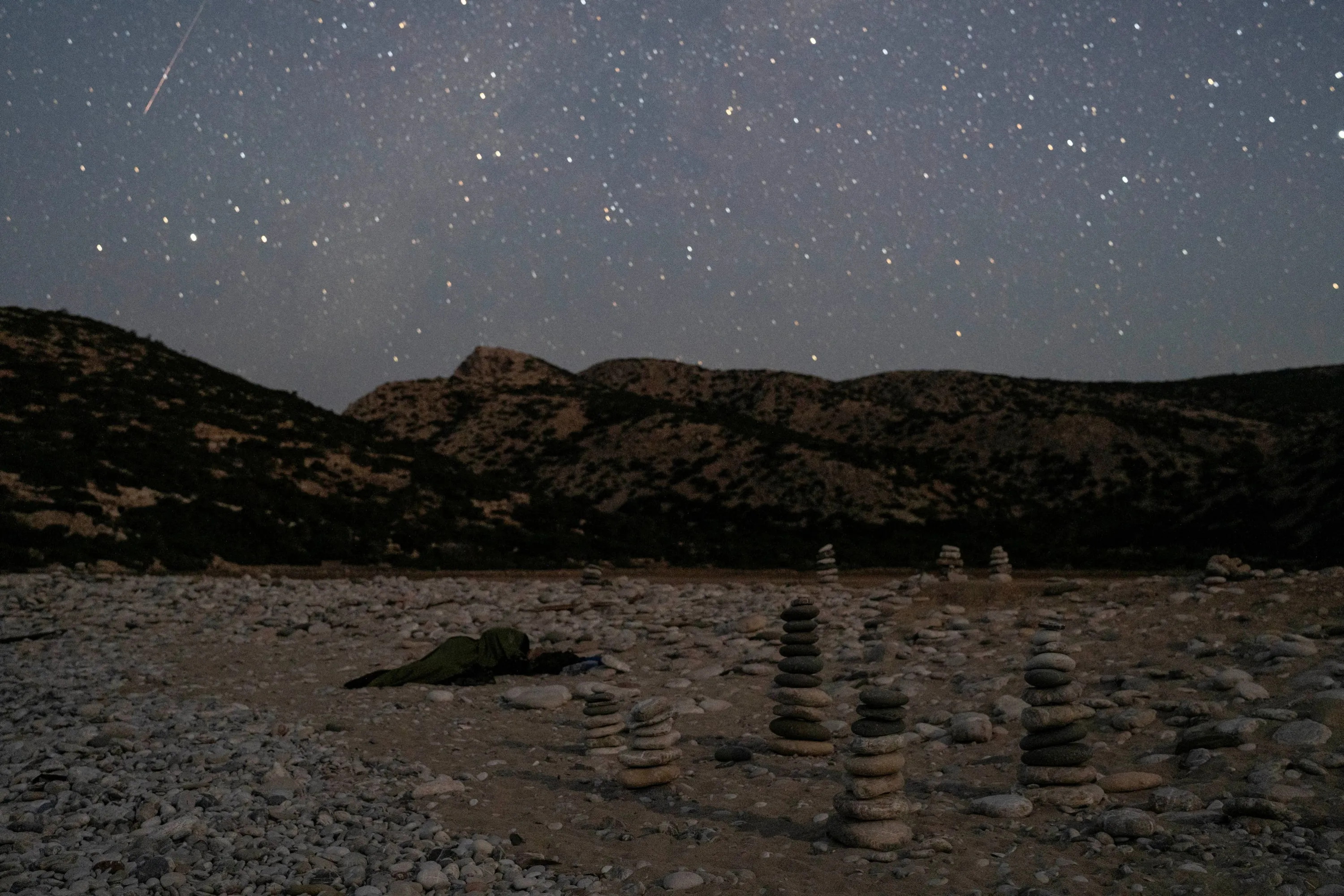 In this photo taken with long shutter speed, a Perseid meteor sparks, while entering the earth's atmosphere as a man sleeps in Tripiti beach in Gavdos island, the southernmost point of Greece and Europe, early Sunday, August13, 2023. (Photo by Petros Giannakouris/AP Photo)