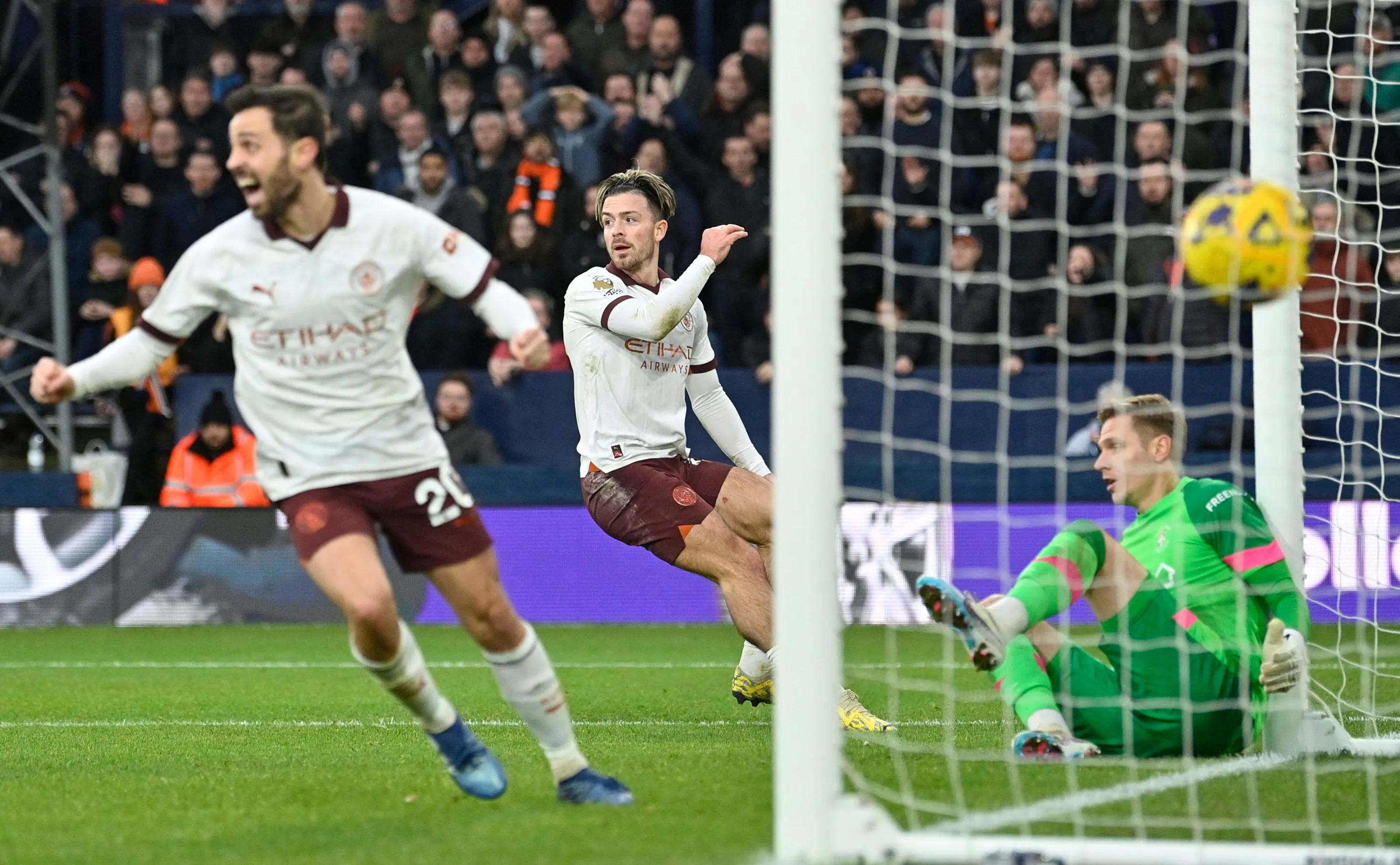 Manchester City's English midfielder #10 Jack Grealish (C) celebrates scoring his team second goal during the English Premier League football match between Luton Town and Manchester City at Kenilworth Road in Luton, north of London on December 10, 2023. (Photo by Justin Tallis/AFP Photo)