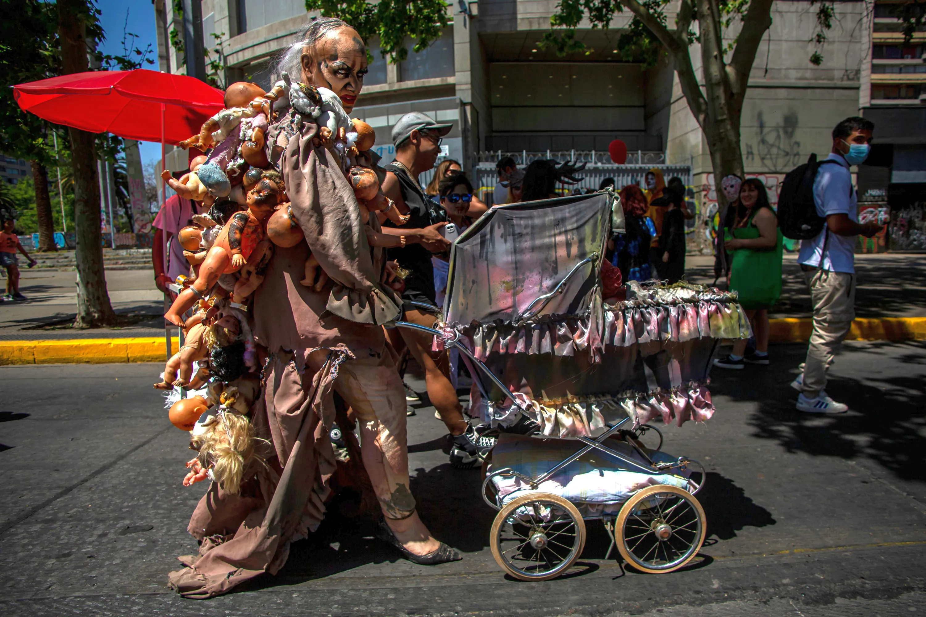 A person wears a horror costume occupying a lot of plastic babies and a vintage car. After three years of absence, zombies and horrible creatures once again marched through the streets of Santiago de Chile on October 15, 2022. Zombie Walk Chile, a huge Halloween costume party, attracted a large number of people and even entire families participated. (Photo by Claudio Abarca Sandoval/NurPhoto via Getty Images)