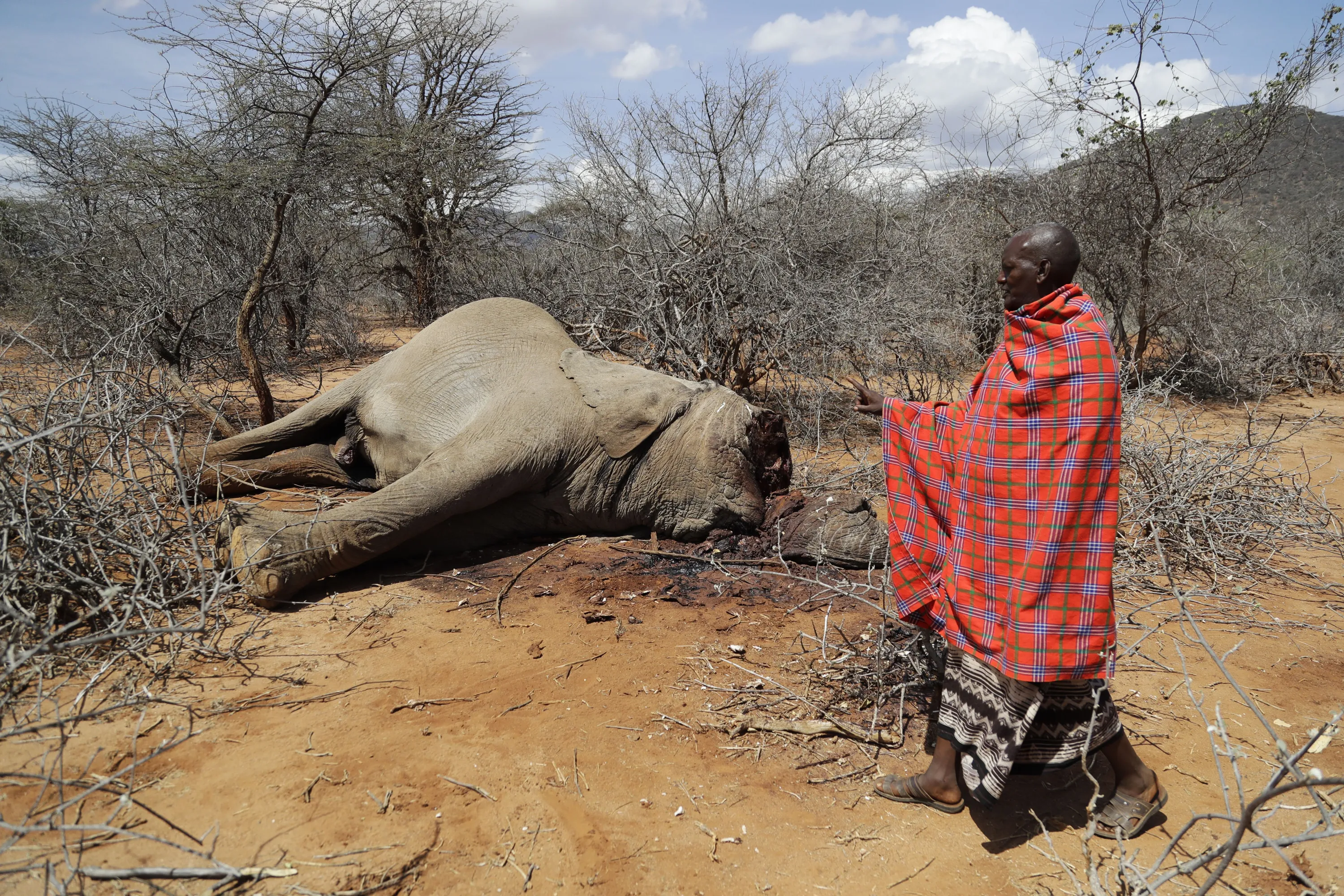 A man checks on an elephant that was killed by Kenya Wildlife Service rangers after it killed a woman as it was looking for water and food amid the drought in Loolkuniyani, Samburu County in Kenya on Tuesday, October 16, 2022. Hundreds of animals have died in Kenyan wildlife preserves during East Africa's worst drought in decades, according to a report released Friday, Nov. 4, 2022. (Photo by Brian Inganga/AP Photo)
