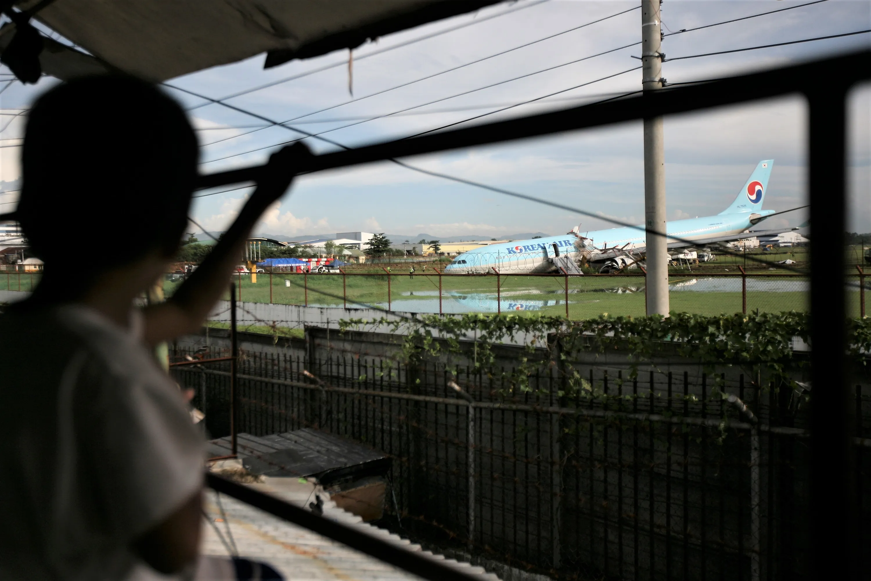 A boy looks at a damaged Korean Air plane after it overshot the runway at the Mactan-Cebu International Airport in Cebu, central Philippines early Monday October 24, 2022. The Korean Air plane overshot the runway while landing in bad weather in the central Philippines late Sunday, but authorities said all 173 people on board were safe. (Photo by Juan Carlo De Vela/AP Photo)
