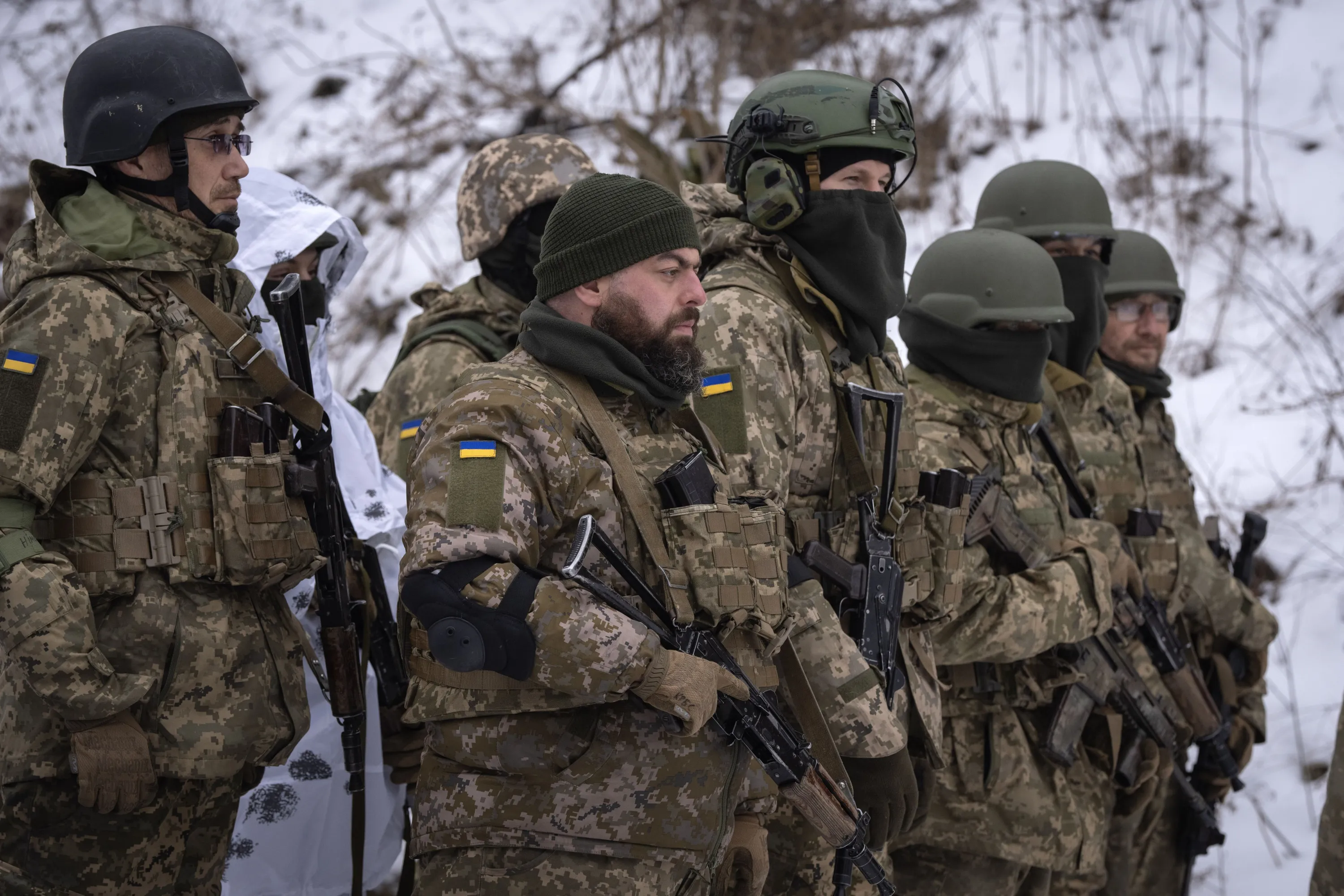 Members of the pro-Ukrainian Russian ethnic Siberian Battalion practice at a military training close to Kyiv, Ukraine, Wednesday, December 13, 2023. (Photo by Efrem Lukatsky/AP Photo)