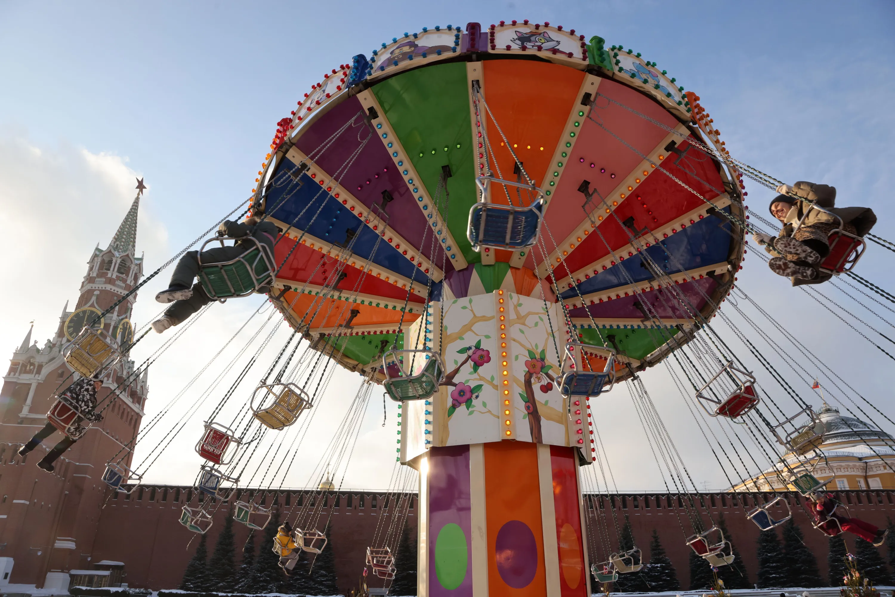 Children ride on a carousel next to the Spassky Tower on Red Square in Moscow, Russia on December 2, 2023. (Photo by Getty Images/Stringer)