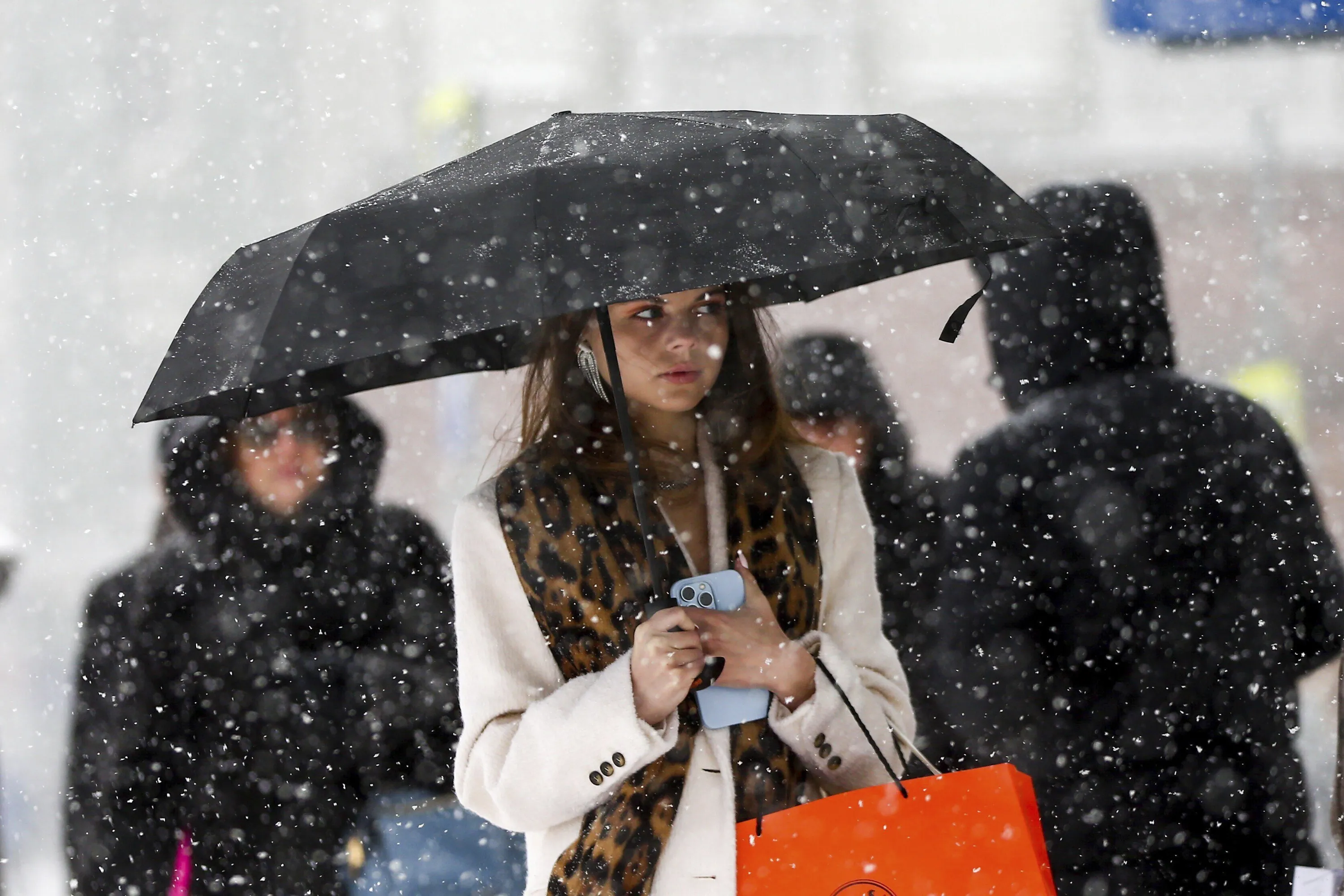 A woman walks down a street during heavy snowfall in Moscow, Russia, Sunday, December 3, 2023. A record snowfall has hit Russia's capital bringing an additional 10 cm to already high levels of snow and causing disruption at the capital's airports and on roads. (Photo by Sergei Vedyashkin/Moscow News Agency via AP Photo)