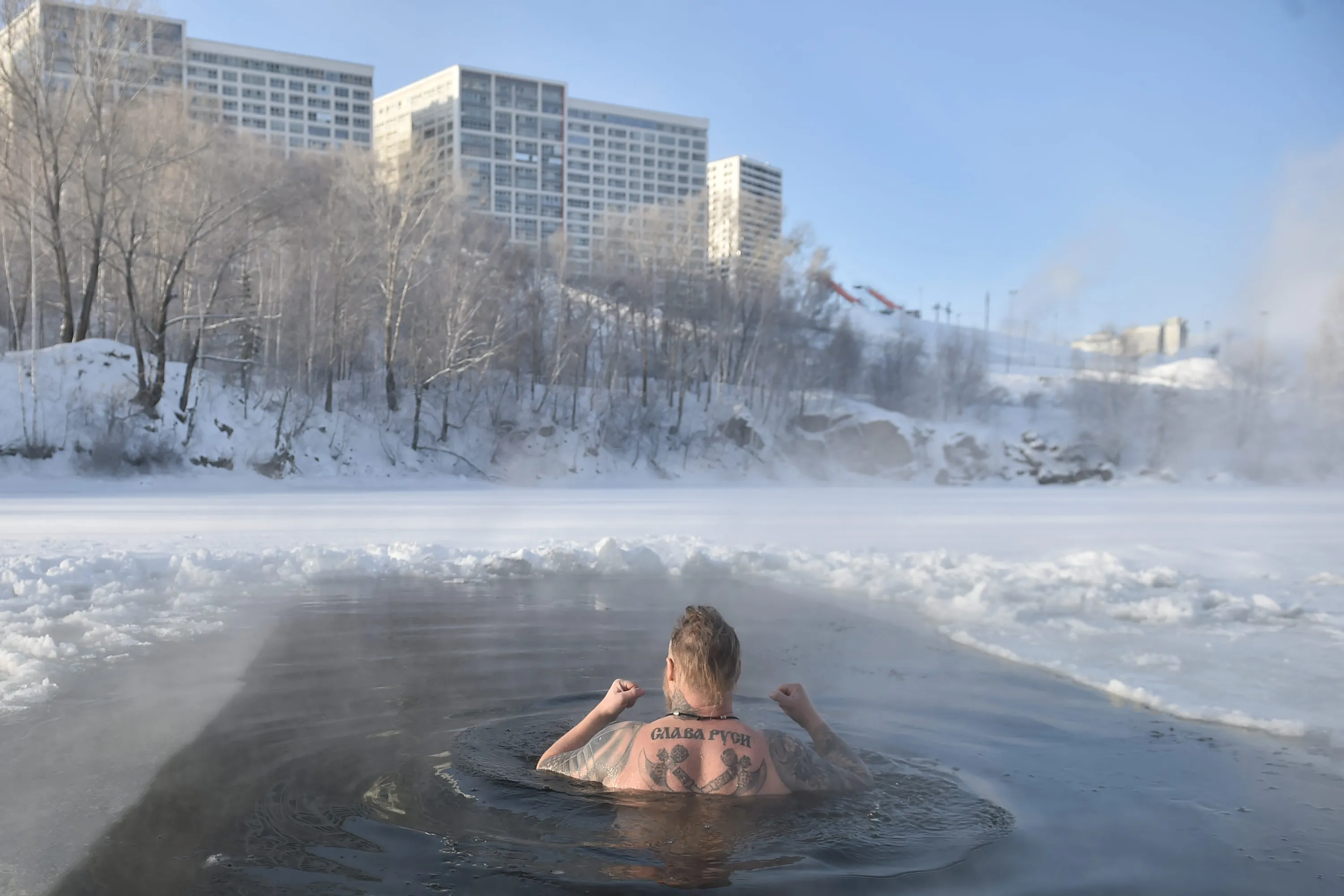 A winter swimming enthusiast swims in an ice hole at a lake in the Siberian city of Novosibirsk with the air temperature at around minus 35 degrees Celsius on December 9, 2023. The tattoo reads “Glory to the Rus (referring to Russia)”. (Photo by Vladimir Nikolayev/AFP Photo)