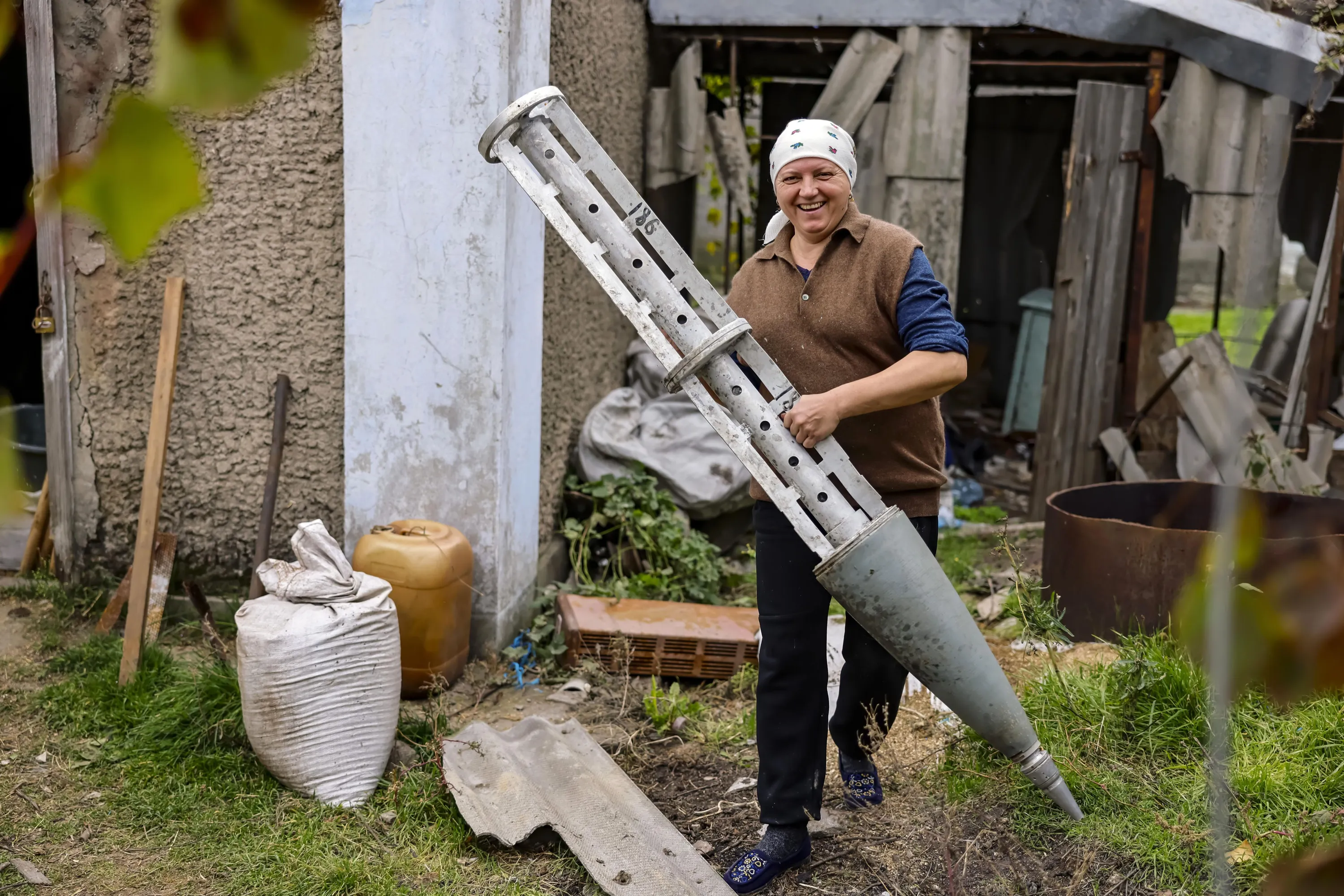 Lina presents a part of a missile she found in her garden in the recaptured village of Osokorivka, Ukraine, 25 October 2022. The village was liberated by Ukrainian forces in the beginning of April but since then it is still under ongoing fire of Russian army. Russian troops on 24 February entered Ukrainian territory, starting a conflict that has provoked destruction and a humanitarian crisis. (Photo by Hannibal Hanschke/EPA/EFE)