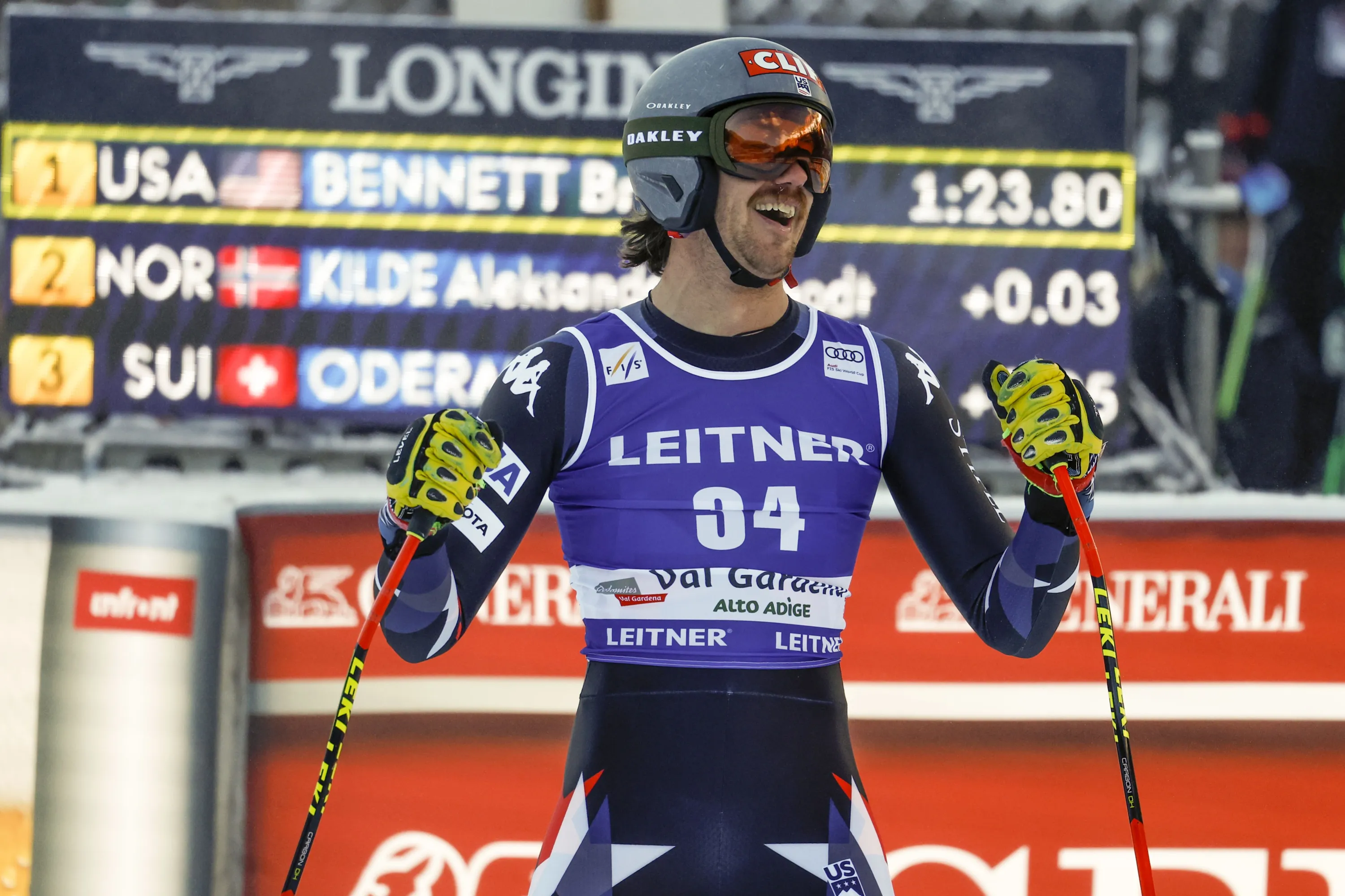 United States' Bryce Bennett celebrates winning an alpine ski, men's World Cup downhill race, in Val Gardena, Italy, Thursday, December 14, 2023. (Photo by Alessandro Trovati/AP Photo)