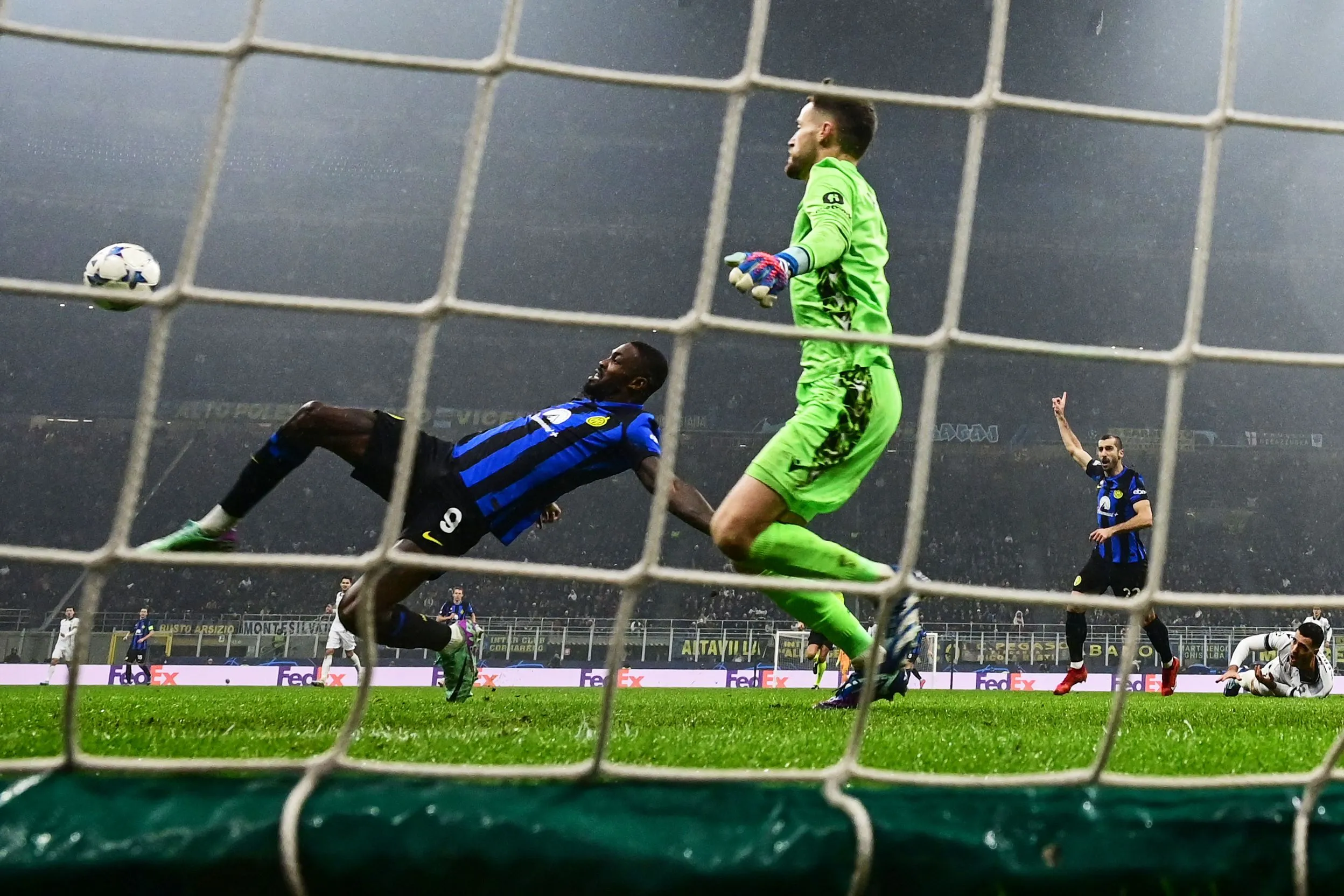 Inter Milan's French forward #09 Marcus Thuram (L) shoots the ball during the UEFA Champions League 1st round day 6 Group D football match between Inter Milan and Real Sociedad at the San Siro stadium in Milan on December 12, 2023. (Photo by Marco Bertorello/AFP Photo)