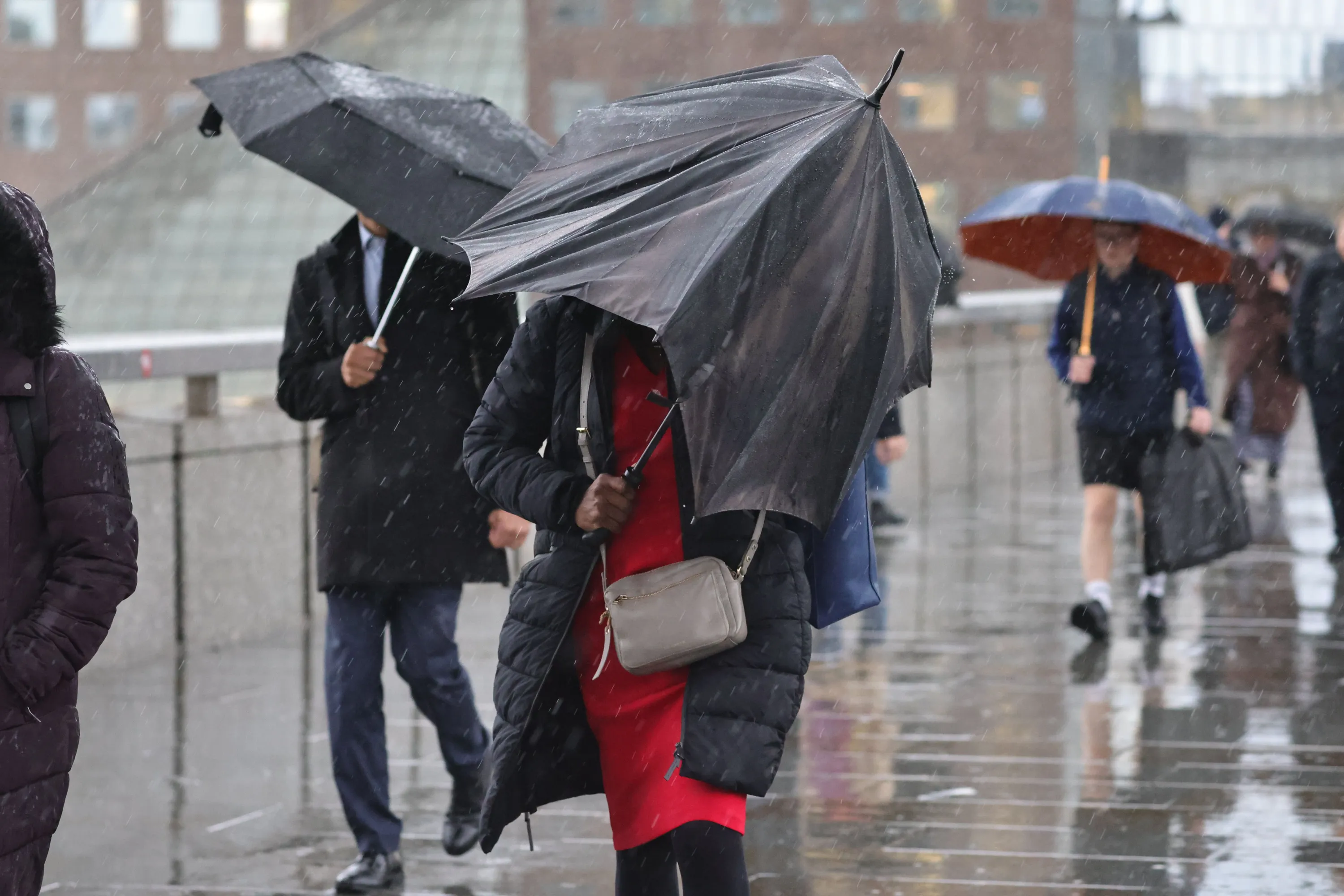 Commuters attempt to shelter as they cross London Bridge during wet and windy weather in Central London on November 1, 2023. Yellow weather warnings for wind and rain are in place for parts of England as Storm Ciarán begins to influence weather in the United Kingdom. (Photo by George Cracknell Wright)