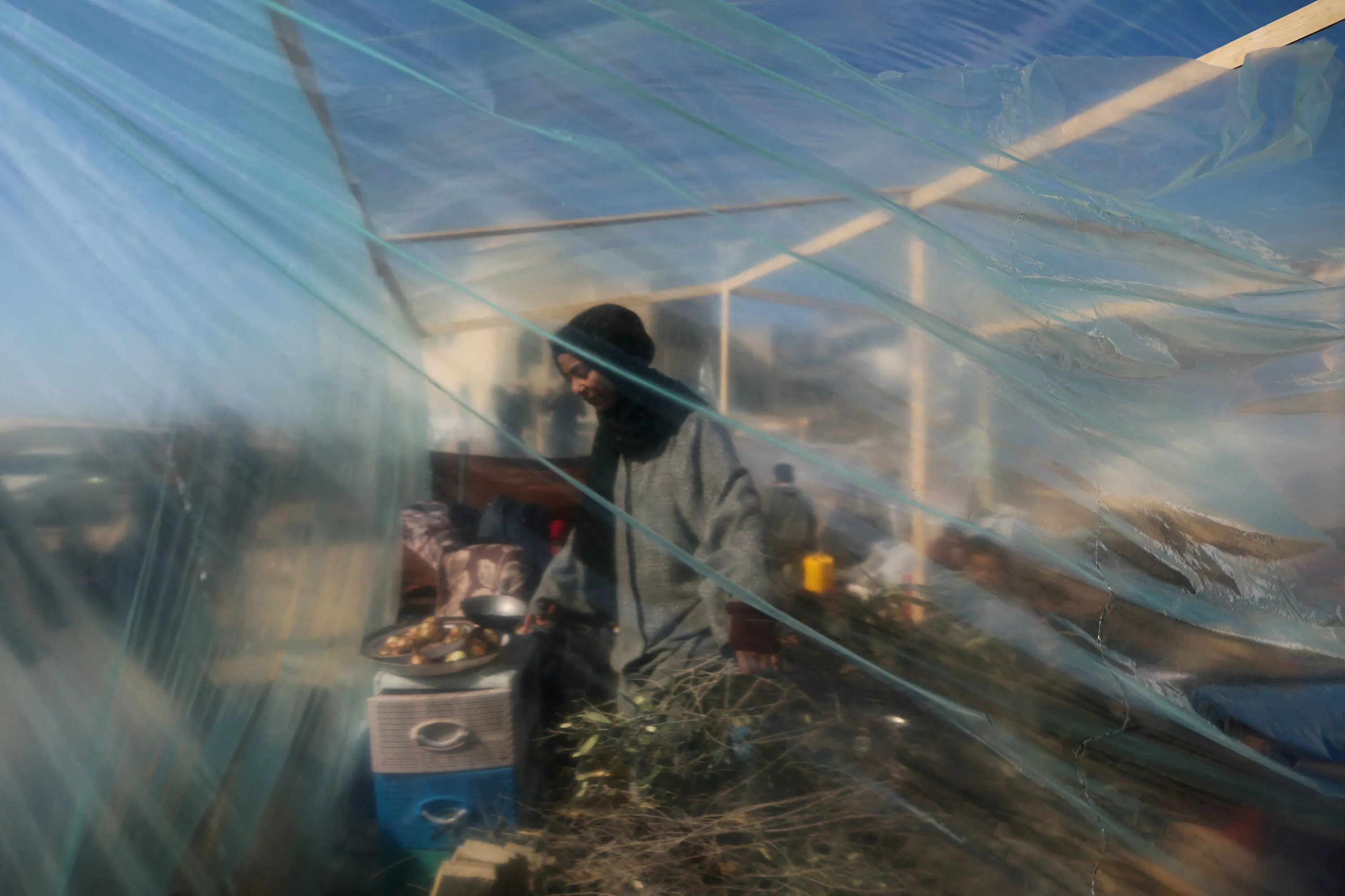 A woman stands inisde a makeshift shelter, as displaced Palestinians, who fled their houses due to Israeli strike, shelter in a camp in Rafah, amid the ongoing conflict between Israel and Palestinian Islamist group Hamas, in the southern Gaza Strip on December 6, 2023. (Photo by Ibraheem Abu Mustafa/Reuters)