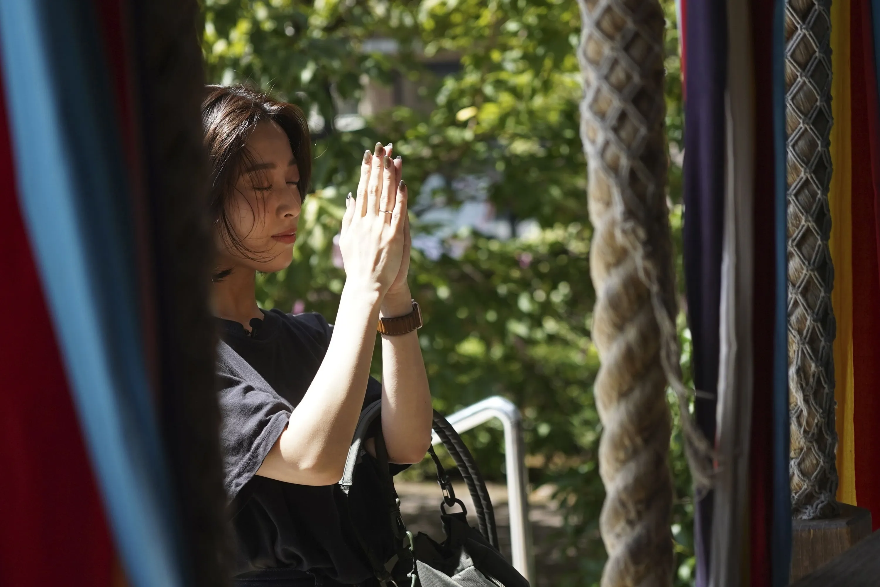 Momo Nomura, a graphic artist and entrepreneur, prays before collecting Goshuin, a seal stamp certifying her visit that comes with elegant calligraphy and the season's drawings, at Sakura Jingu in Tokyo on August 30, 2023. She performs the prescribed rituals – ringing a bell, bowing and clapping. But her main purpose is getting a Goshuin, a stamp with elegant calligraphy that shrines provide for a fee to certify the visit. (Photo by Eugene Hoshiko/AP Photo)