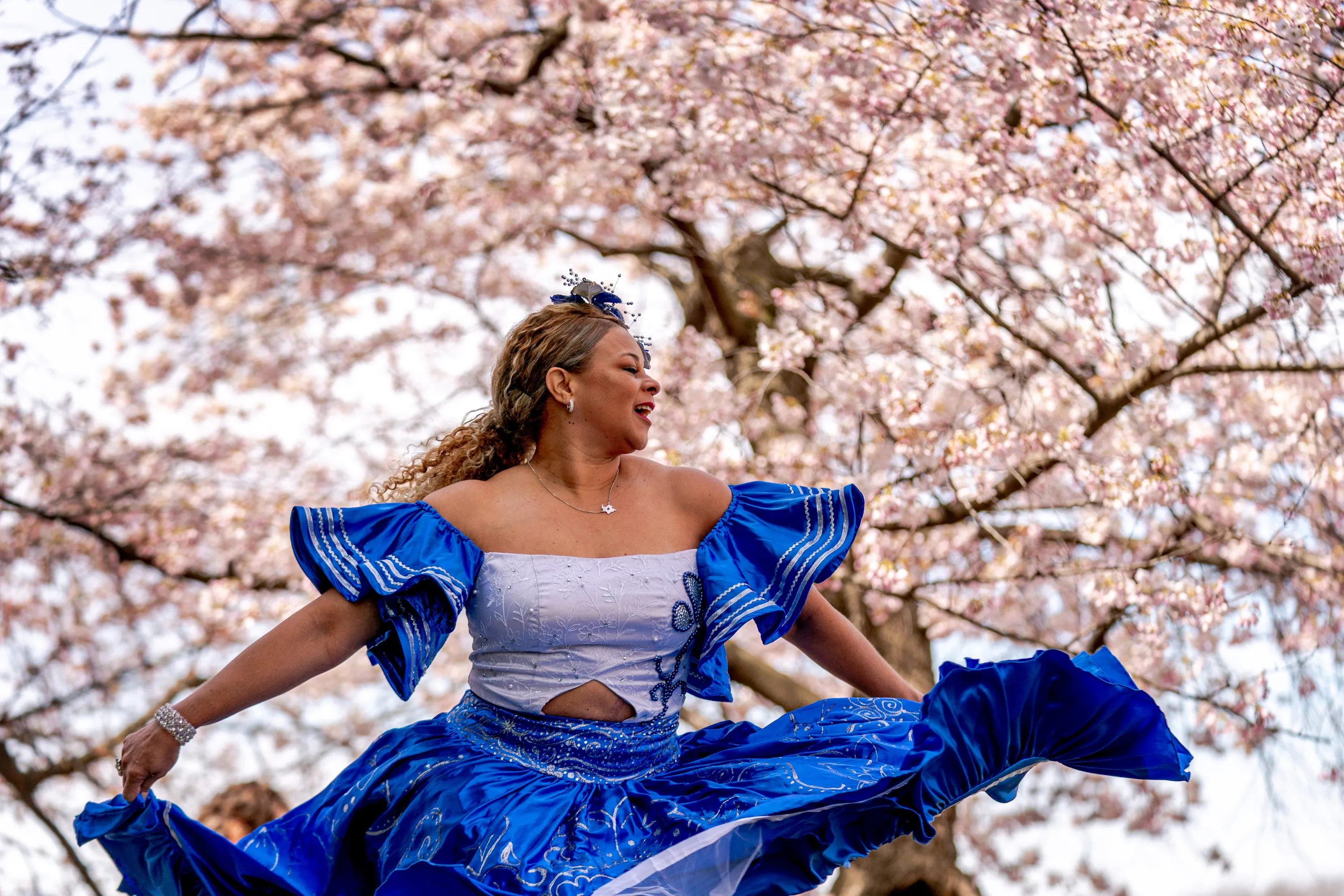 Guijara Solano, a Colombian woman living in Arlington, Va., films herself dancing along the Tidal Basin as cherry blossoms enter their peak bloom this week in Washington, Tuesday, March 21, 2023. (Photo by Andrew Harnik/AP Photo)