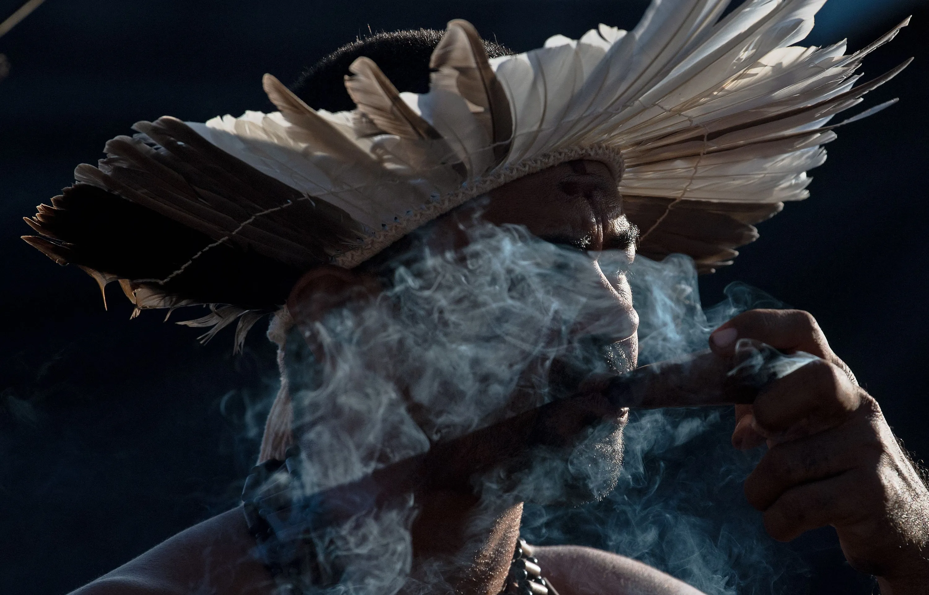 A man from the Kambiwa tribe of Pernambuco smokes a pipe during a traditional ritual at an indigenous protest camp on the second day of the Terra Livre Indigenous Camp in Brasilia on April 5, 2022. The 10-day annual protest, which is held by indigenous people from tribes that arrive from all over Brazil, calls for greater protection of their land and rights. (Photo by Carl de Souza/AFP Photo)