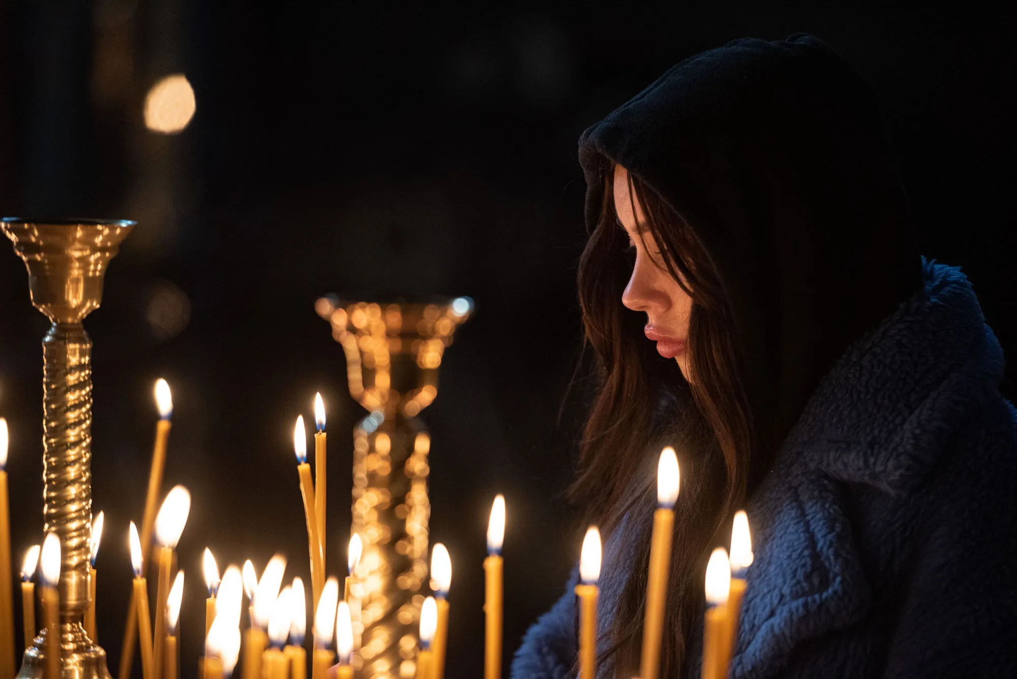 A woman prays during Easter church service at the St. Michaels Golden-Domed Cathedral on April 24, 2022 in Kyiv, Ukraine. Orthodox Easter celebrations come as Ukraine marks two months since the start of Russia's February 24 invasion, a war that has killed untold thousands of civilians and soldiers. As Russia concentrates its attack on the country's east and south, Ukrainians elsewhere claim their dead and clean up the damage, striving for a semblance of normalcy in wartime. (Photo by Alexey Furman/Getty Images)