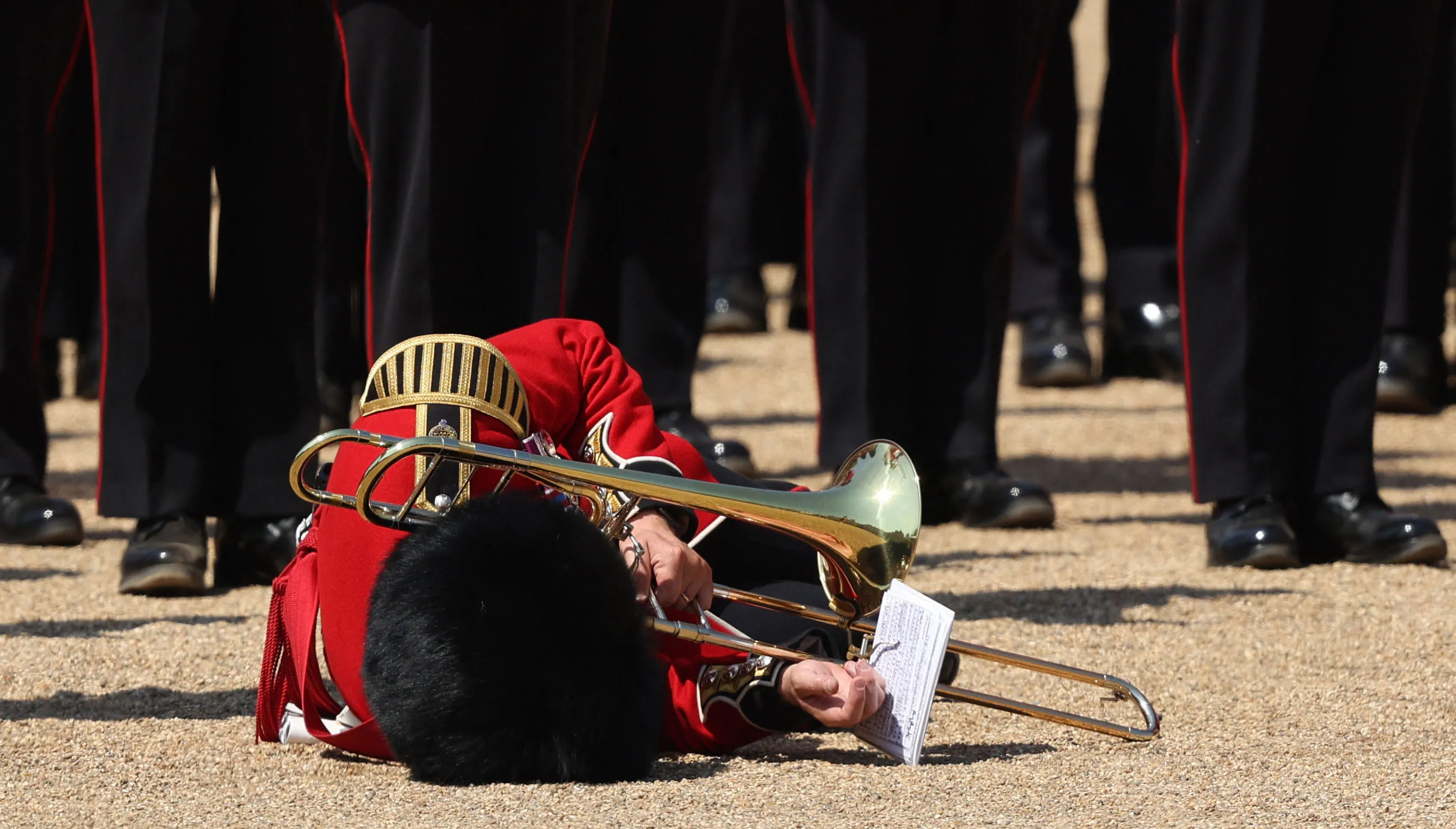 A trombone player faints as the band marches during the Colonel's Review at Horse Guards Parade in London on June 10, 2023 ahead of The King's Birthday Parade. The Colonel's Review is the final evaluation of the parade before it goes before Britain's King Charles III during the Trooping of the Colour on June 17. (Photo by Adrian Dennis/AFP Photo)