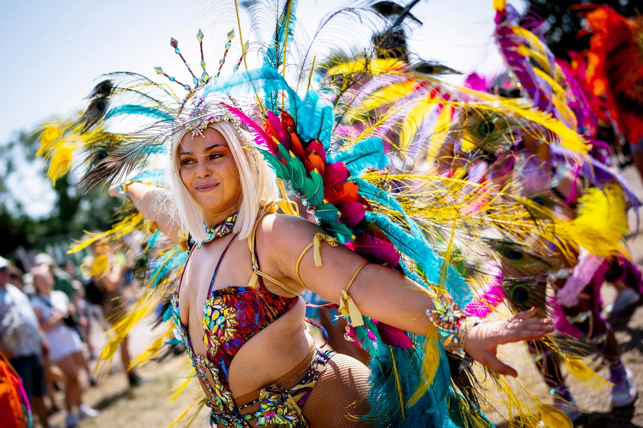Notting Hill Carnival performers pass through the site at the Glastonbury Festival in Worthy Farm, Somerset, England, Thursday, June 22, 2023. (Photo by Scott Garfitt/Invision/AP Photo)