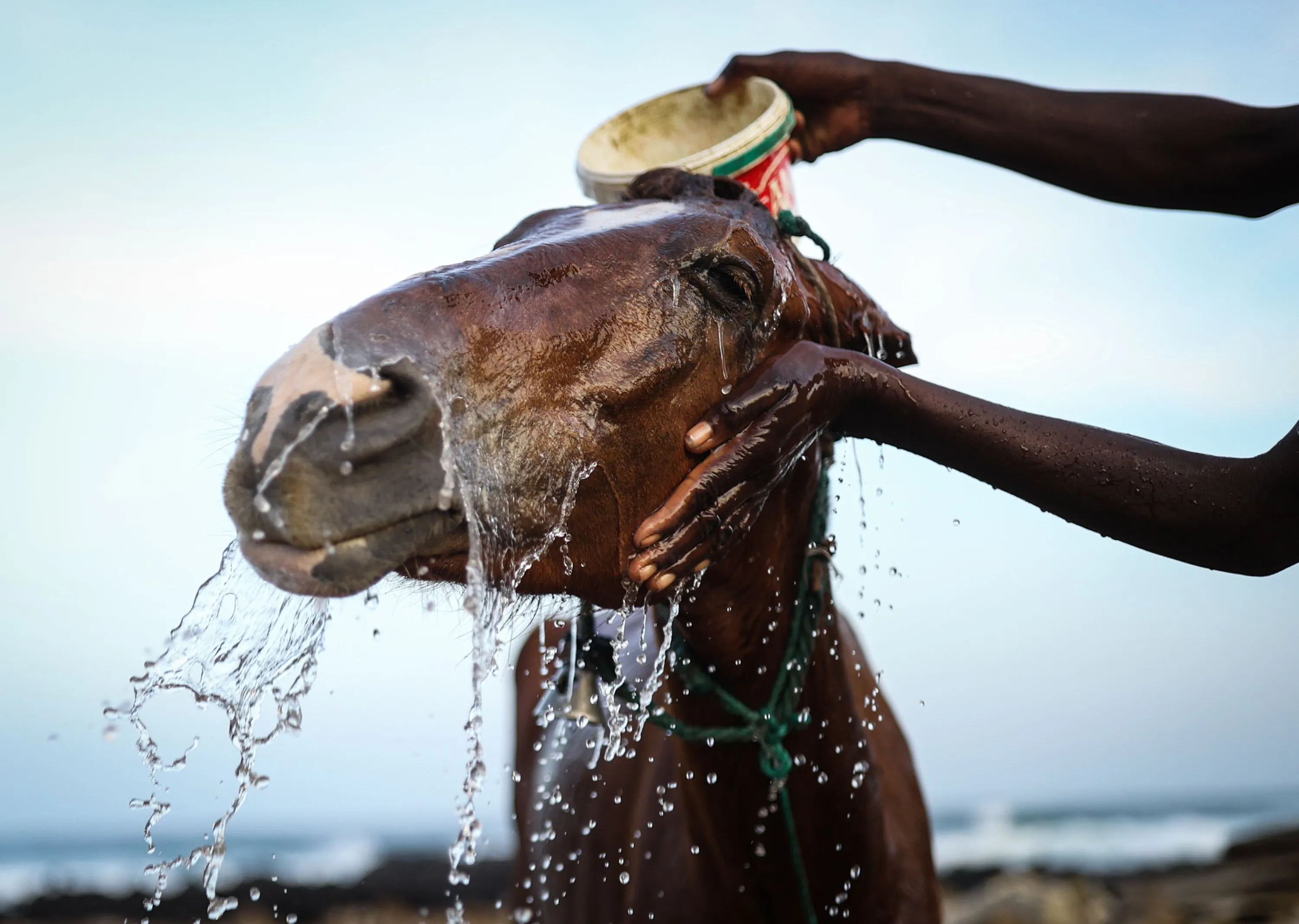 A man washes his horse at Yoff Beach in Dakar, Senegal on December 02, 2023.Senegalese people widely use horses and horse-drawn carriages in transportation and transport, despite rapid urbanization in the country. There are over 7,000 horse carriages in the capital Dakar that it is possible to see them in every corner of the city. The horses kept in the sheds near Yoff Beach of the city, start to be washed with the first light of the morning. After being washed they generally serve as transportation for fishermen on Yoff Beach to send to fish to markets or cold storages. In addition to transporting fish, horse-drawn carriages are also used as a cheaper way of transportation. (Photo by Cem Ozdel/Anadolu via Getty Images)