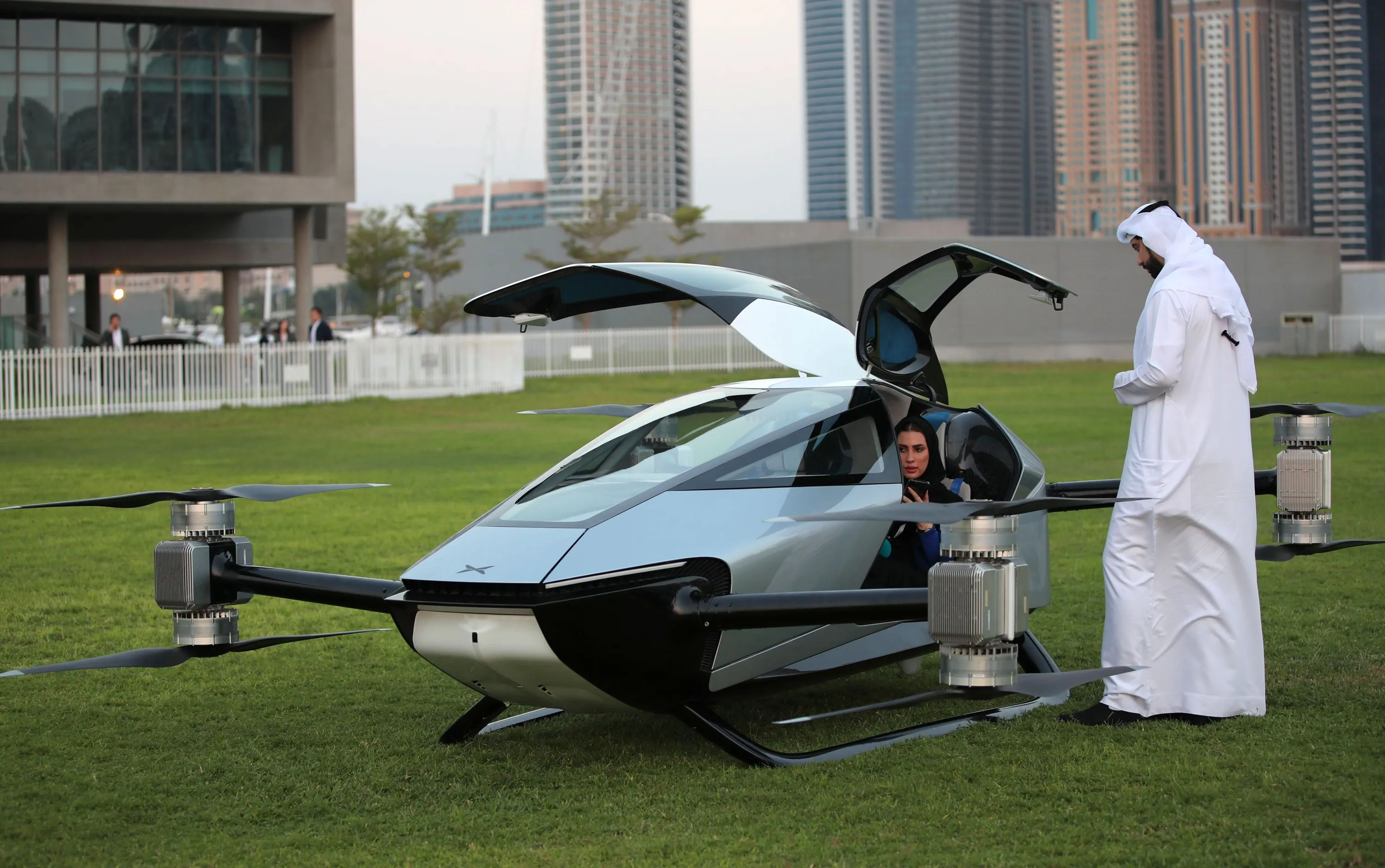 Emiratis inspect the eVTOL flying car X2 during the world-first public flight as part of the Gulf Information Technology Exhibition (GITEX) Global 2022 at the runway of SkyDive Dubai in the Gulf emirate of Dubai, United Arab Emirates, 10 October 2022. In partnership with the Dubai International Chamber, XPENG and EV manufacturer specialised in designing, developing, manufacturing, and marketing intelligent mobility solutions has chosen Dubai to be hosting exclusively the world-first public flight of its pioneering eVTOL flying car X2. (Photo by Ali Haider/EPA/EFE/Rex Features/Shutterstock)