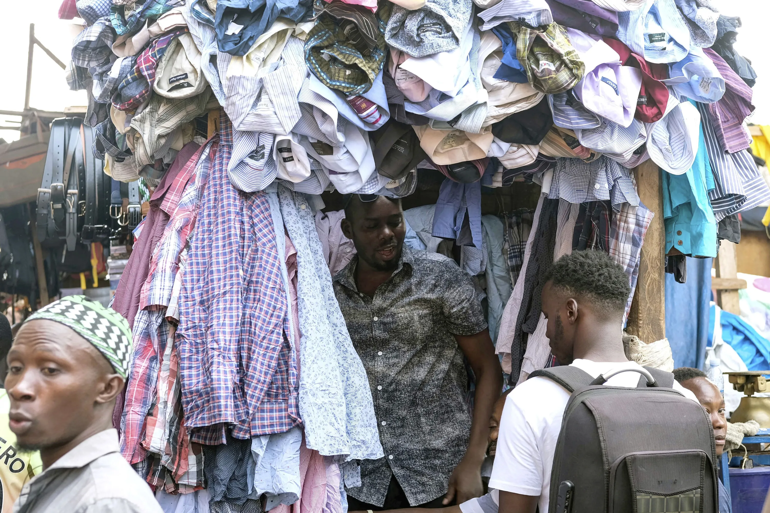 A seller of second hand clothes interacts with a customer at Owino Market in Kampala, Uganda, Friday, September 15, 2023. Downtown Kampala’s Owino Market has long been a go-to enclave for rich and poor people alike looking for affordable but quality-made used clothes, underscoring perceptions that Western fashion is superior to what is made at home. But, despite their popularity, secondhand clothes are facing increasing pushback. (Photo by Hajarah Nalwadda/AP Photo)