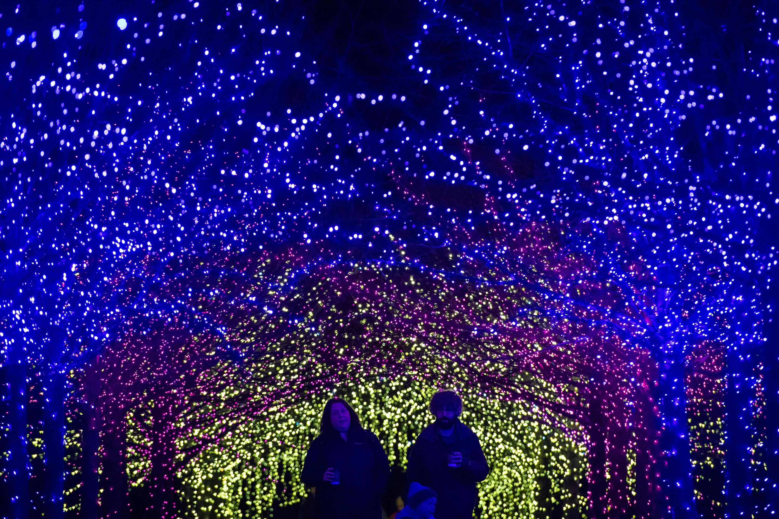 Visitors attend the 34th edition of the “Stockbridge Main Street at Christmas”, a holiday lights show, at Naumkeag in Stockbridge, Massachusetts, on December 15, 2023. (Photo by Joseph Prezioso/AFP Photo)