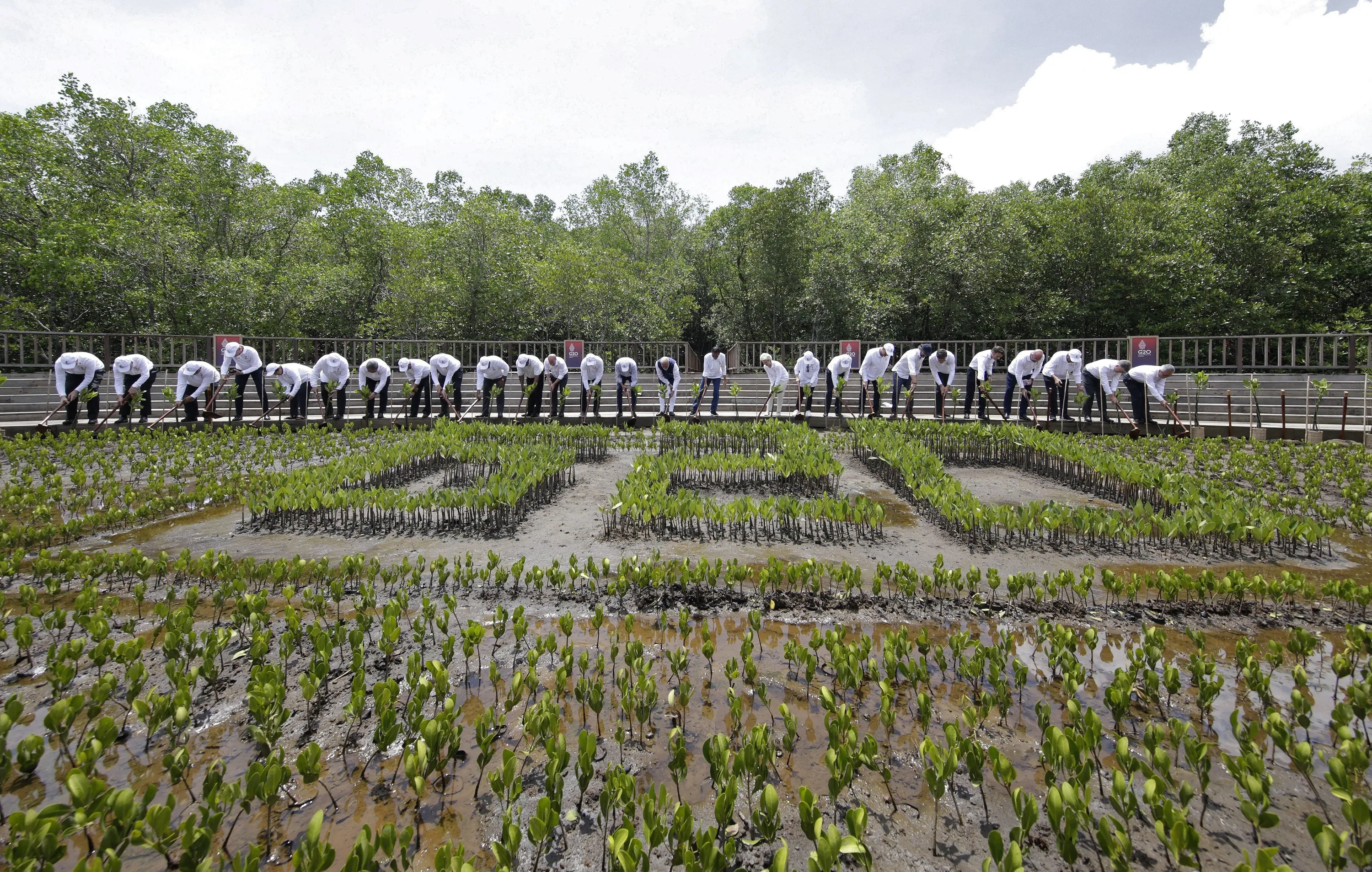 Leaders plant their seedlings during a mangrove planting event at the Tahura Ngurah Rai Mangrove Forest Park as part of the G20 Leaders' Summit in Nusa Dua, on the Indonesian resort island of Bali on November 16, 2022. (Photo by Mast Irham/Pool via AFP Photo)