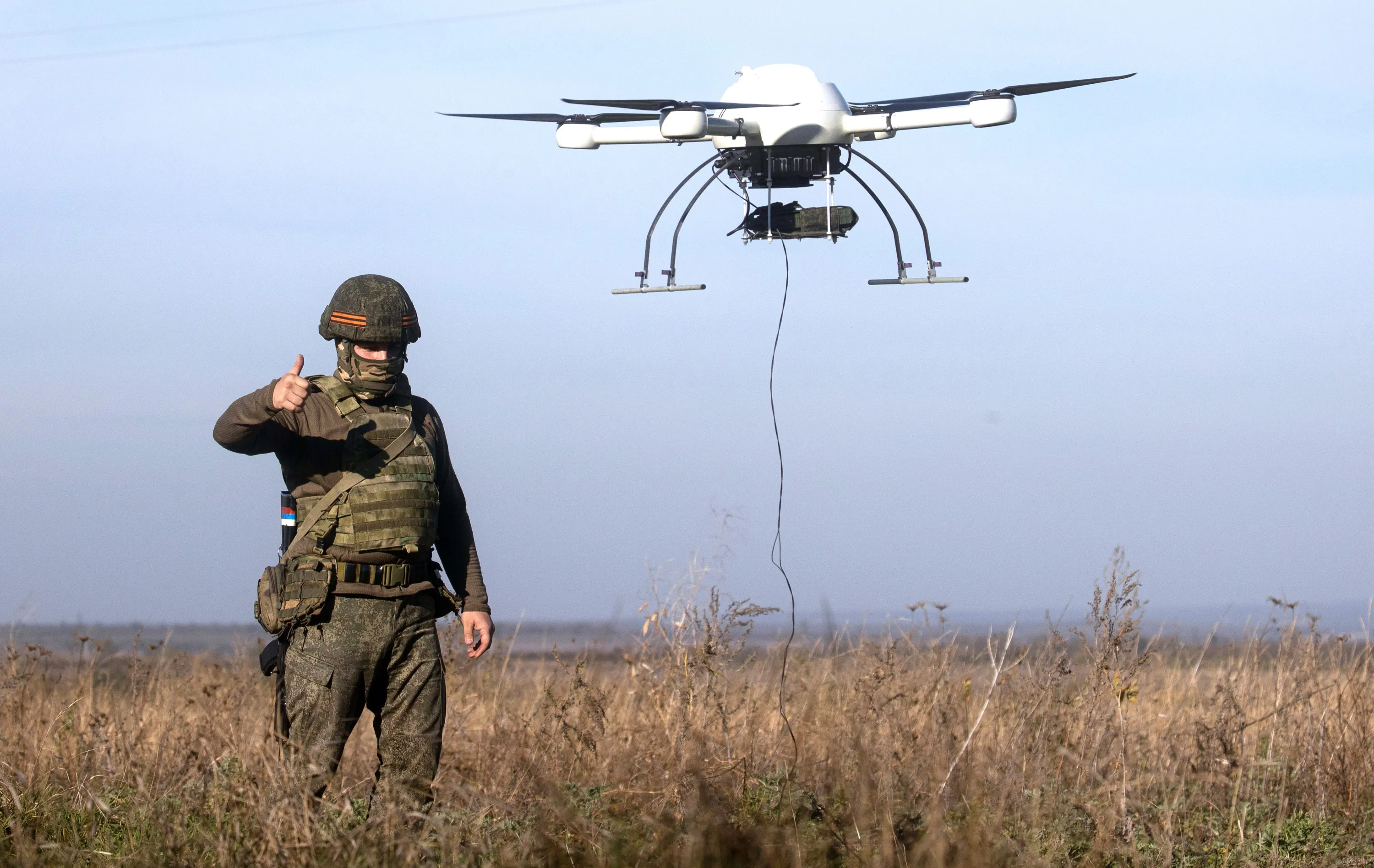 A serviceman operates a Kvazimachta hardware raising system of the Russian Central Military District in the zone of Russia's special military operation on November 3, 2022. Sibir-1 and Griffon UAVs can move along with advancing forces without moving control posts and losing connection quality. The use of communication drones allows to increase covertness and survival of communications units, as well as to set up data transmission channels in adverse terrains. UAVs can also carry out video surveillance and reconnaissance. (Photo by Stanislav Krasilnikov/TASS)