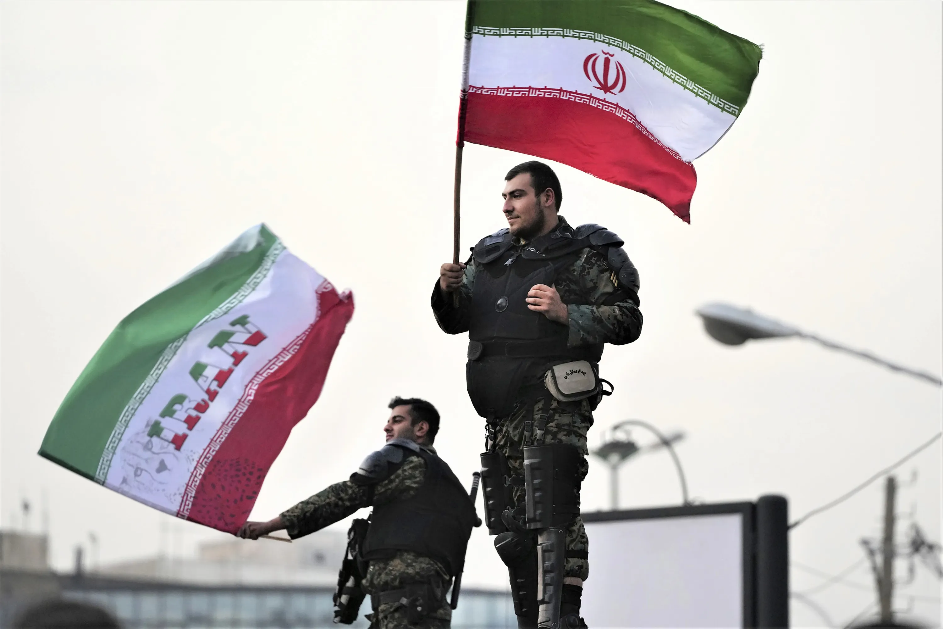 Two anti-riot police officers wave the Iranian flags during a street celebration after Iran defeated Wales in Qatar's World Cup, at Sadeghieh Sq. in Tehran, Iran, Friday, November 25, 2022. Iran's political turmoil has cast a shadow over Iran's matches at the World Cup, spurring tension between those who back the team and those who accuse players of not doing enough to support the protests that started Sept. 16 over the death of a 22-year-old woman in the custody of the morality police. (Photo by Vahid Salemi/AP Photo)