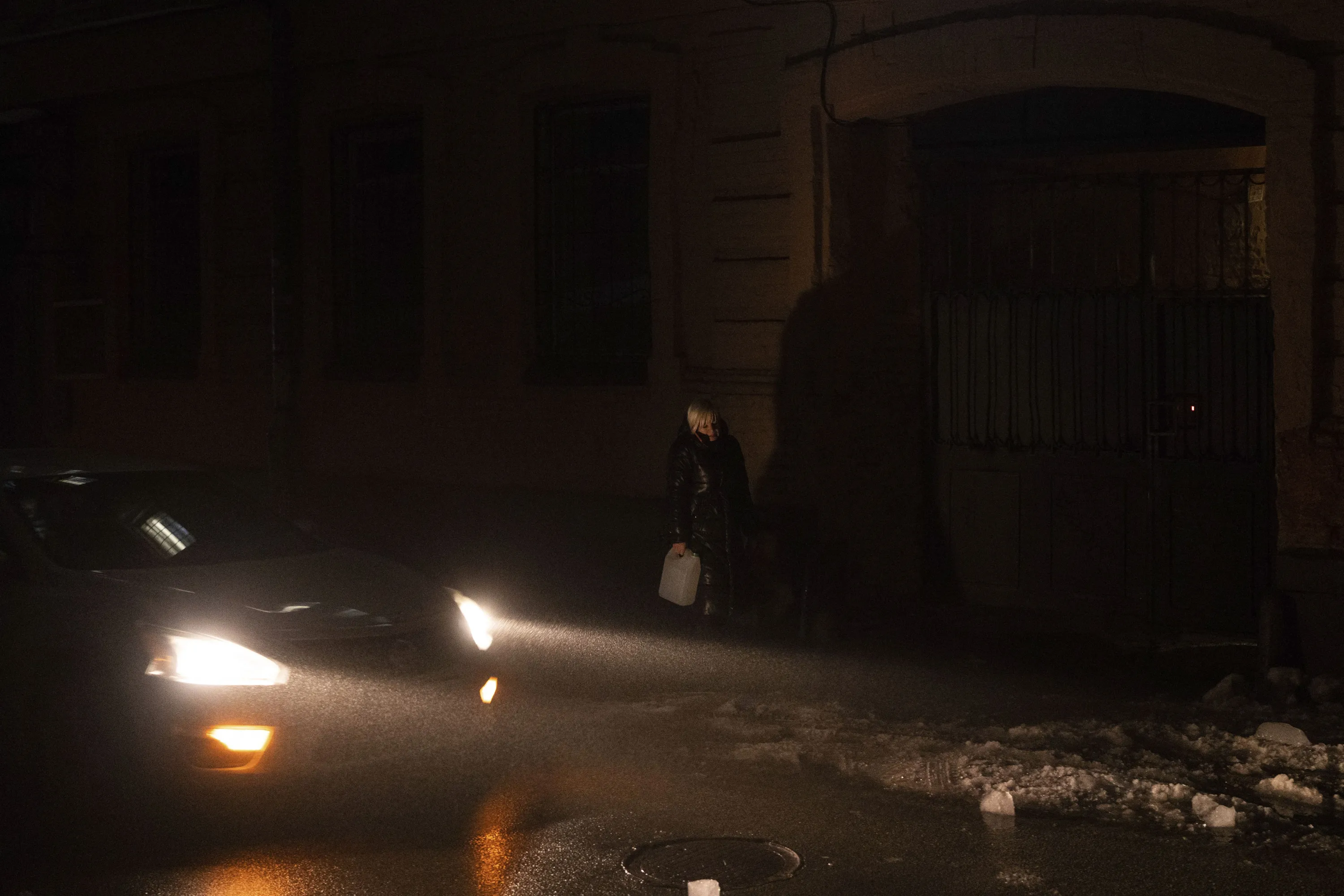 A woman carries a bucket with water at the city center which lost electrical power after yesterday's Russian rocket attack in Kyiv, Ukraine, Thursday, November 24, 2022. Russia unleashed a new missile onslaught on Ukraine's battered energy grid Wednesday, robbing cities of power and some of water and public transport, too, compounding the hardship of winter for millions. (Photo by Evgeniy Maloletka/AP Photo)