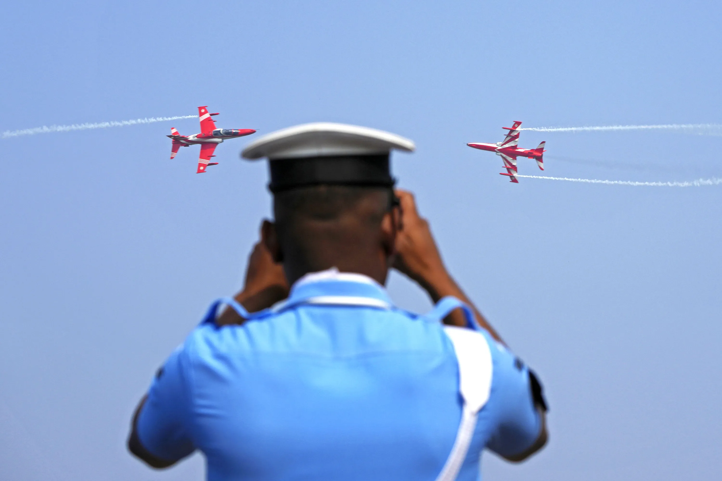 Indian Air Force's aerobatic team Suryakiran perform during the graduation ceremony of new cadets on the outskirts of Hyderabad, India, Sunday, December 17, 2023. A total of 213 cadets were commissioned as officers in flying and ground duty branches on completion of their training Sunday. (Photo by Mahesh Kumar A./AP Photo)