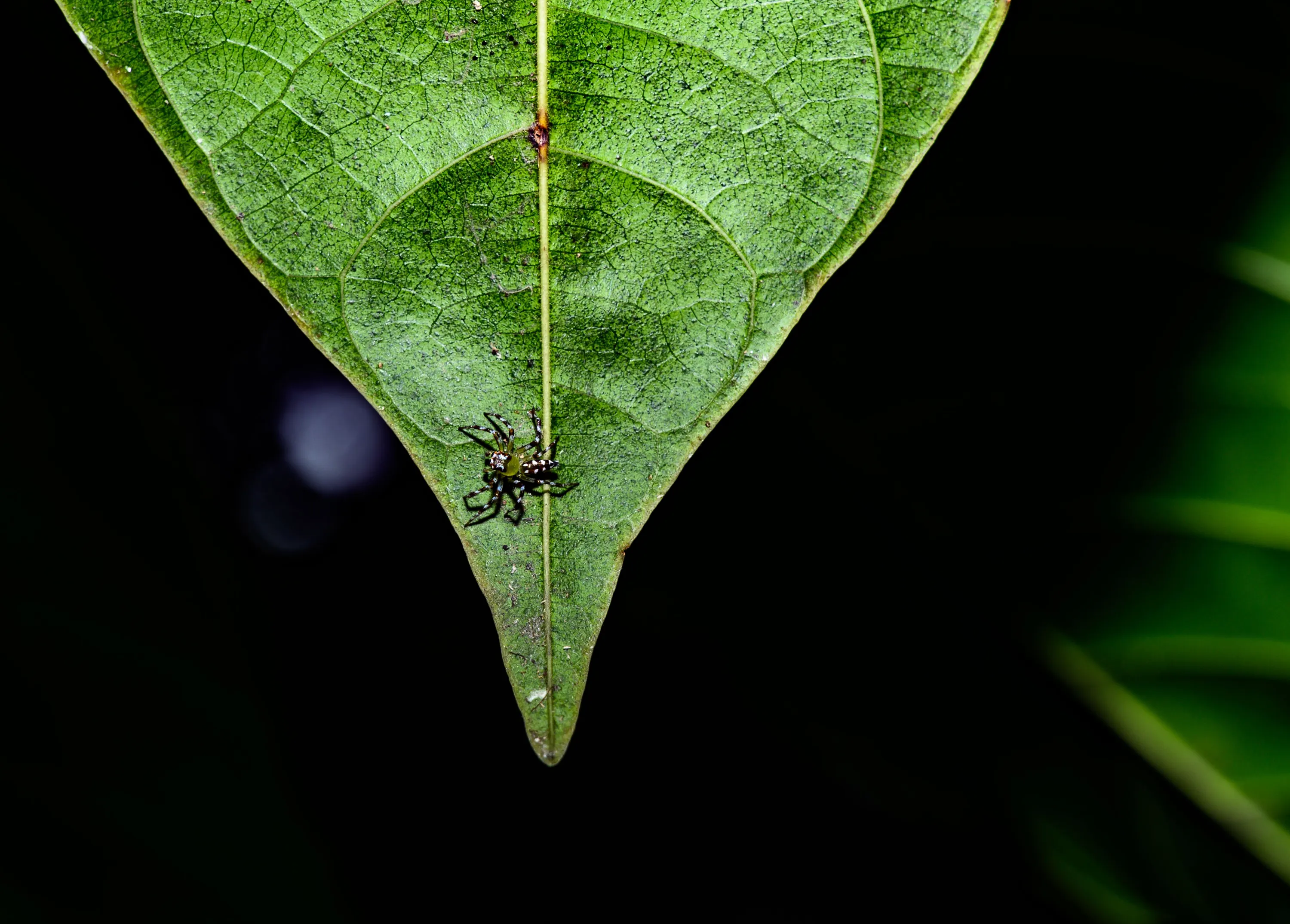 An Epeus triangulopalpis male spider is hides behind the leaves of a tree to catch its prey at Tehatta, West Bengal, India on October 7, 2023. Epeus is a genus of the spider family Salticidae (jumping spiders). They are often found on broad-leaved plants or shrubs of rain forest, or in gardens of Southeast Asia. Females are 7-9 mm long, males 6-9 mm. They are long-legged with a long opisthosoma, and quite colorful. Males have a characteristic v-shaped crest of raised, long hairs on the head, resembling a mohawk. (Photo by Soumyabrata Roy/NurPhoto/Rex Features/Shutterstock)