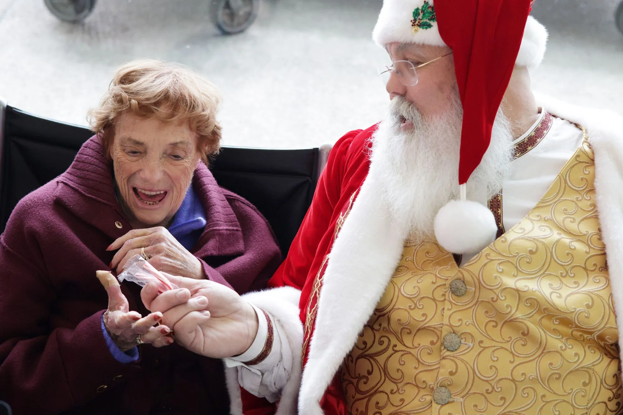 A man dressed as Santa Claus greets a passenger with a candy cane at Dulles International Airport on December 21, 2023 in Dulles, Virginia. AAA predicted that this travel season will be the second-busiest holiday travel season since 2000. (Photo by Alex Wong/Getty Images)