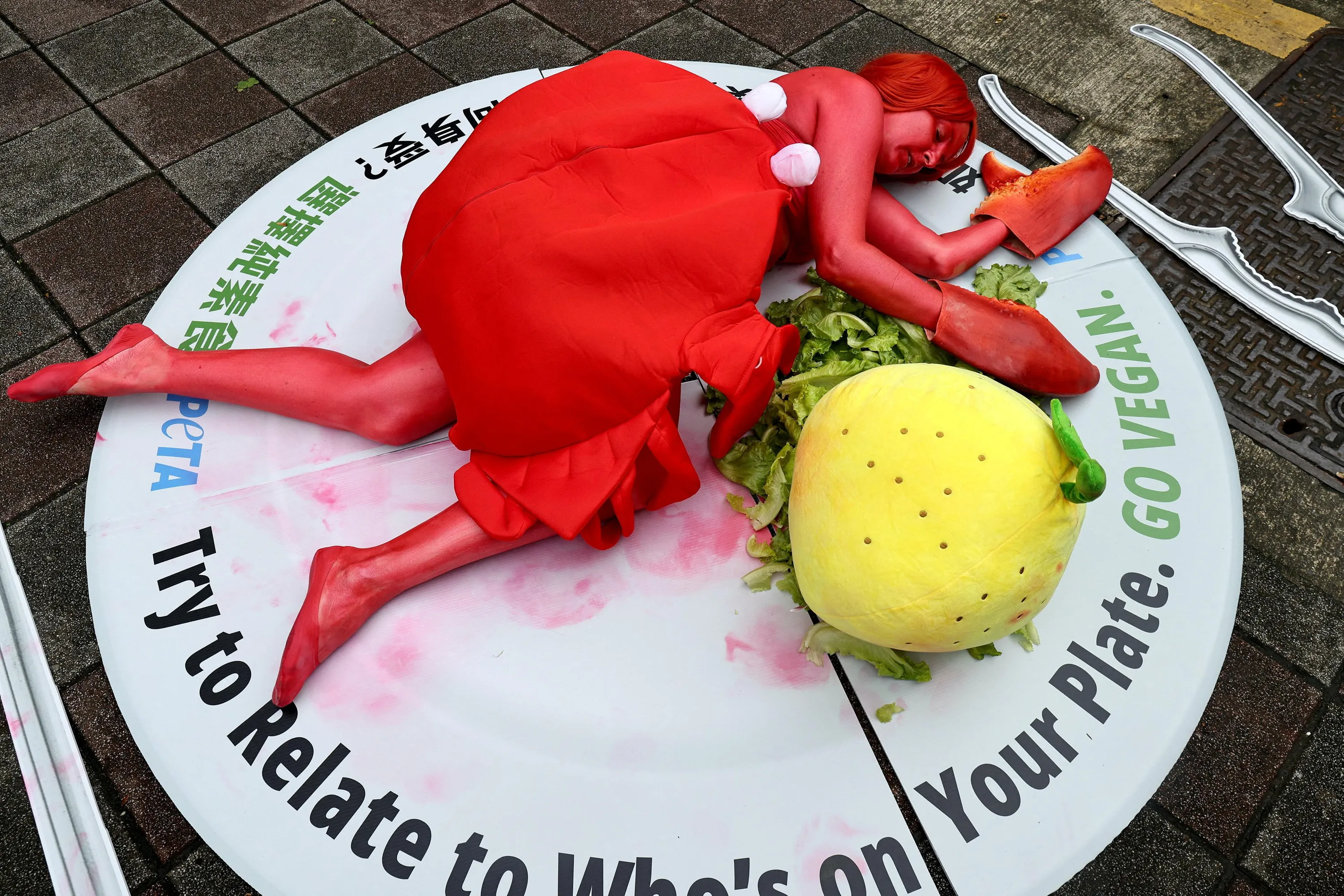 An animal rights activist bodypainted as a crab lies down in front of the fish market to encourage people to think about the food they eat, in Taipei, Taiwan on November 25, 2022. (Photo by Ann Wang/Reuters)