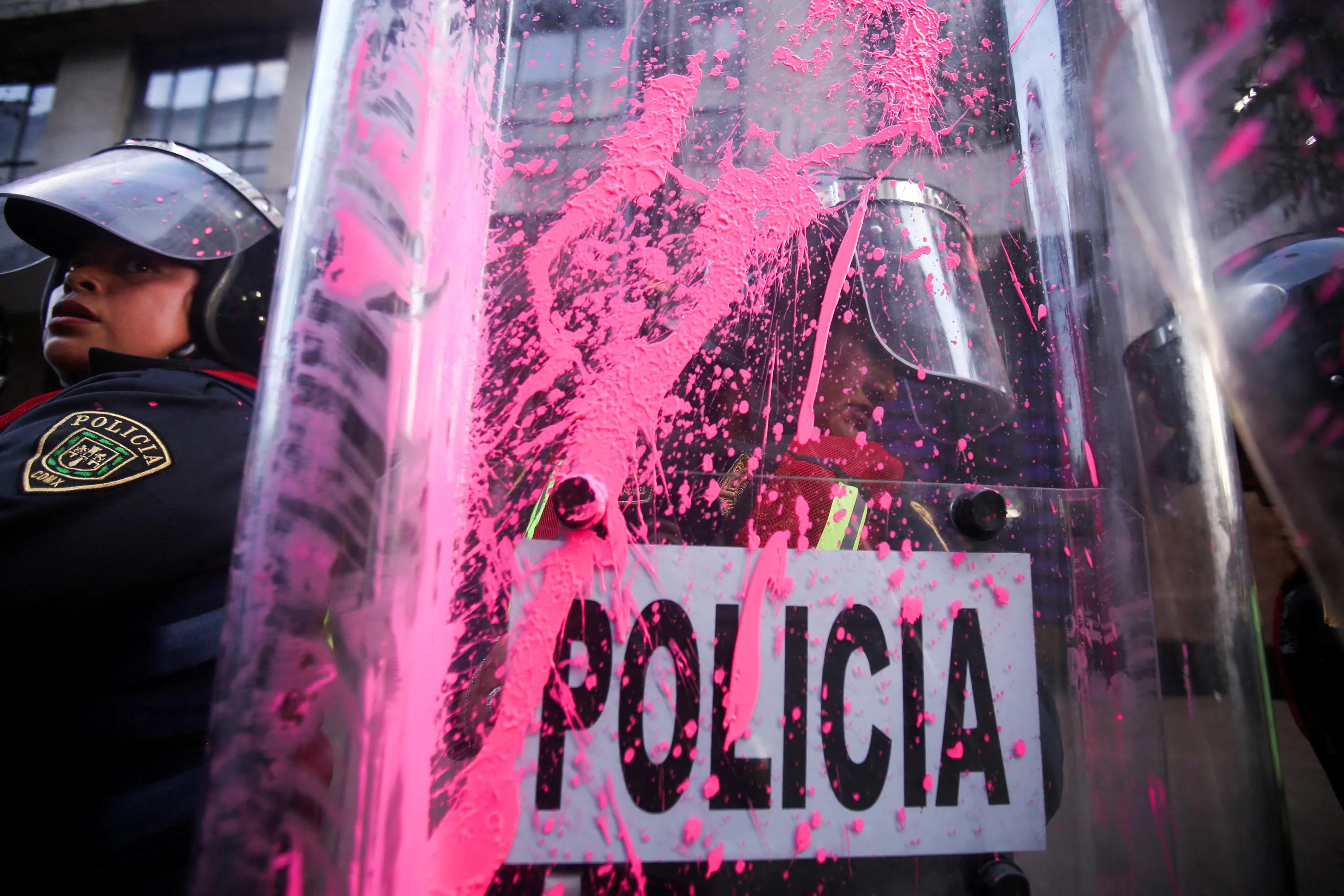 Pink paint is seen on a police shield as police officers stand guard during a protest to mark the International Day for the Elimination of Violence Against Women, in Mexico City, Mexico on November 25, 2022. (Photo by Quetzalli Nicte-Ha/Reuters)