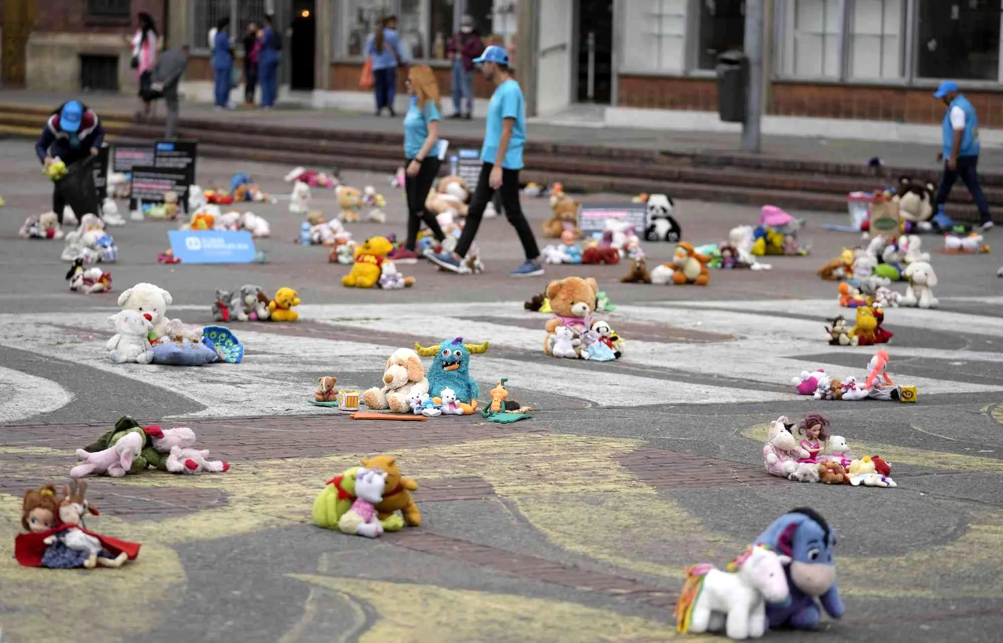 Toys cover the plaza, 20 of July, where they were placed by people protesting violence against children in Bogota, Colombia, Tuesday, November 22, 2022. Stuffed animals, dolls and action figures were laid out to also demand more funding for organizations that help children who are growing up without their biological parents. (Photo by Fernando Vergara/AP Photo)