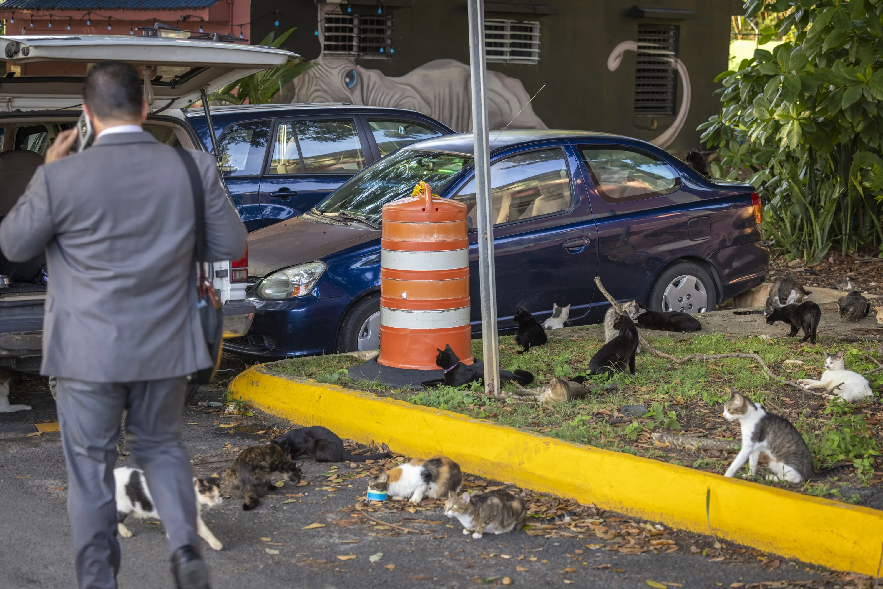 Stray cats mill around a parking lot as a person returns from work to pick up his car in Old San Juan, Puerto Rico, Wednesday, November 2, 2022. The cat population has grown so much that the U.S. National Park Service is seeking to implement a “free-ranging cat management plan” that considers options including removal of the animals, outraging many who worry they will be killed. (Photo by Alejandro Granadillo/AP Photo)