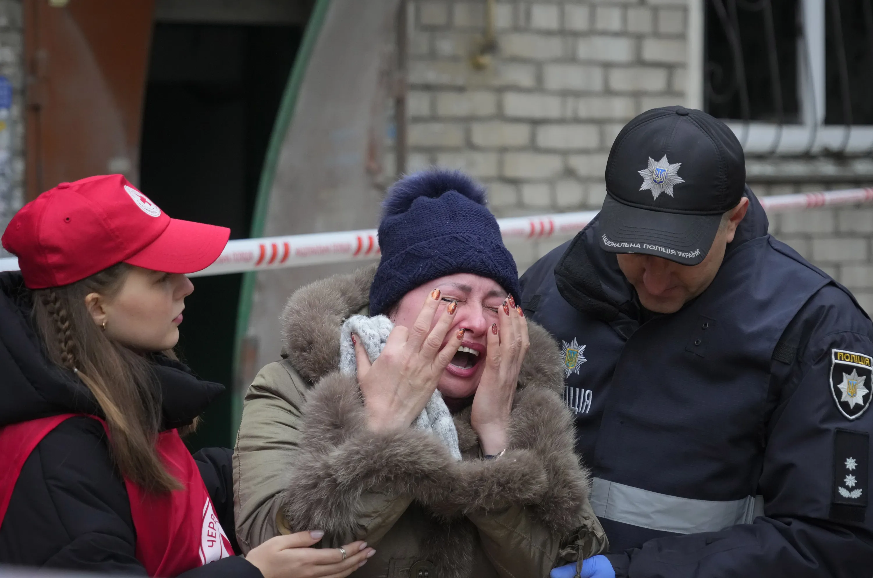 A woman is comforted by servicemen as she cries at the scene of night shelling in Mykolaiv, Ukraine, Friday, November 11, 2022. (Photo by Efrem Lukatsky/AP Photo)