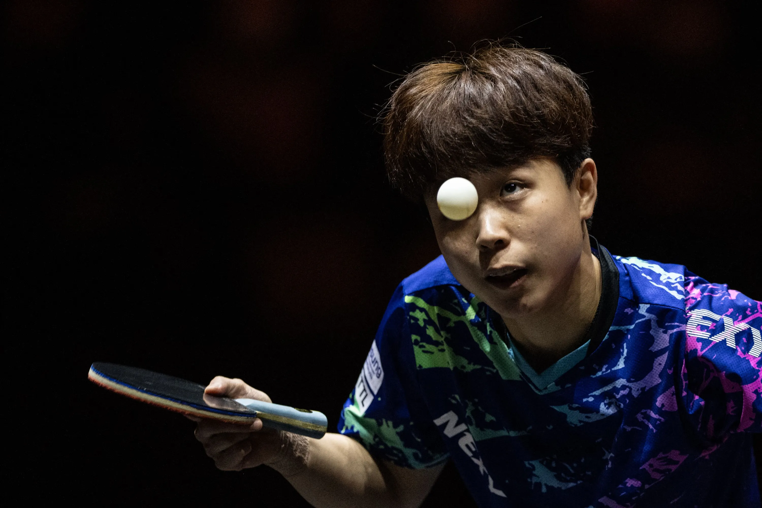 South Korea's Joo Cheon-hui eyes the ball during the women's singles R16 table tennis match against Germany's Han Ying at the WTT Finals Women Nagoya 2023 in Nagoya on December 15, 2023. (Photo by Philip Fong/AFP Photo)