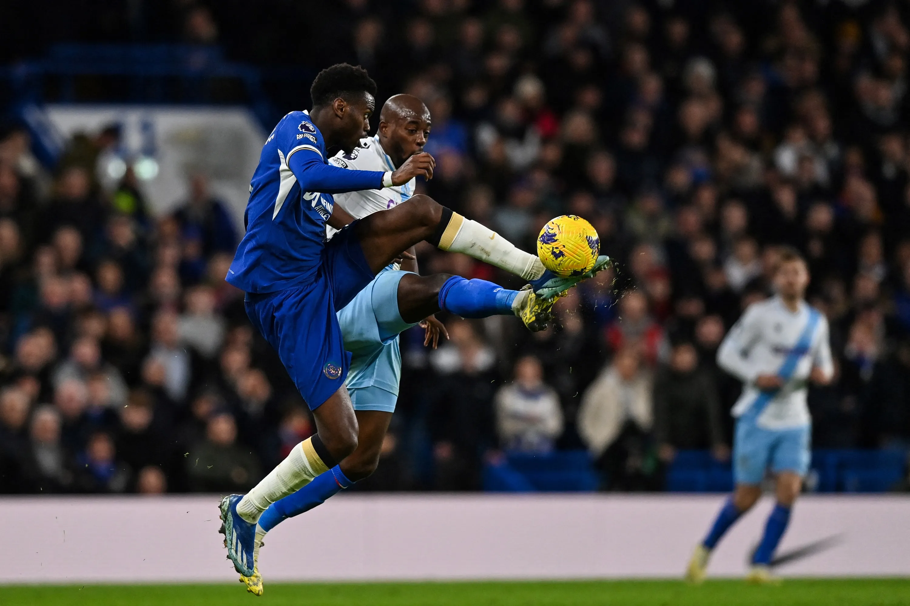 Chelsea's French defender #05 Benoit Badiashile (L) fights for the ball with Crystal Palace's French striker #14 Jean-Philippe Mateta during the English Premier League football match between Chelsea and Crystal Palace at Stamford Bridge in London on December 27, 2023. (Photo by Glyn Kirk/AFP Photo)